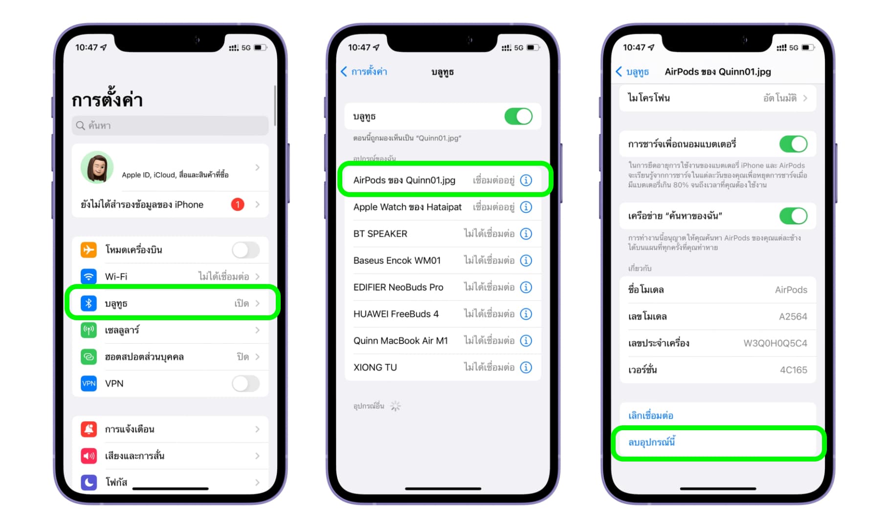 เข้าไปที่ การตั้งค่า > บลูทูธ > แต่ที่สัญลักษณ์ตัว i ข้างชื่อ AirPods ของเรา > ลบอุปกรณ์นี้