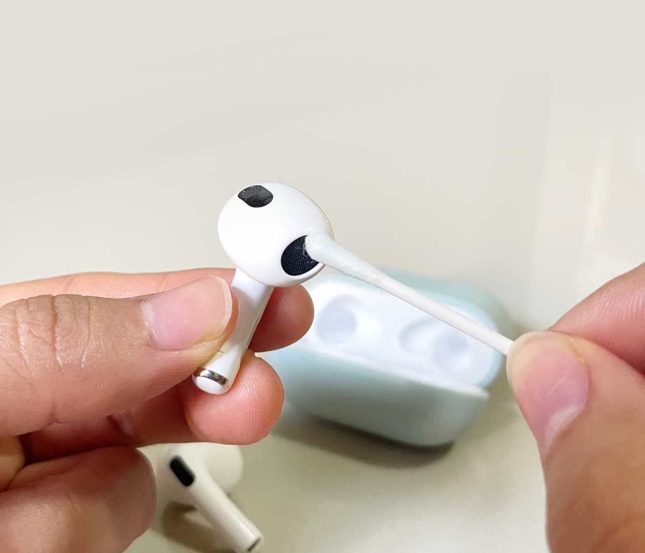 ทำความสะอาดด้วยสำลีหรือคอตตอนบัด อาจใช้ผ้าเช็ดทำความสะอาดหรือว่าแปรงที่มีขนาดเล็กปัดเศษฝุ่นและคราบไคลต่าง ๆ ออกไป พยายามอย่าให้ AirPods เปียกน้ำ เพราะอาจทำให้เกิดความเสียหายได้ ให้ใช้สำลีจุ่มน้ำหรือแอลกอฮอล์เพียงเล็กน้อย ทำด้วยควาระมัดระวัง ไม่ต้องใช้แรงมากจนเกินไป