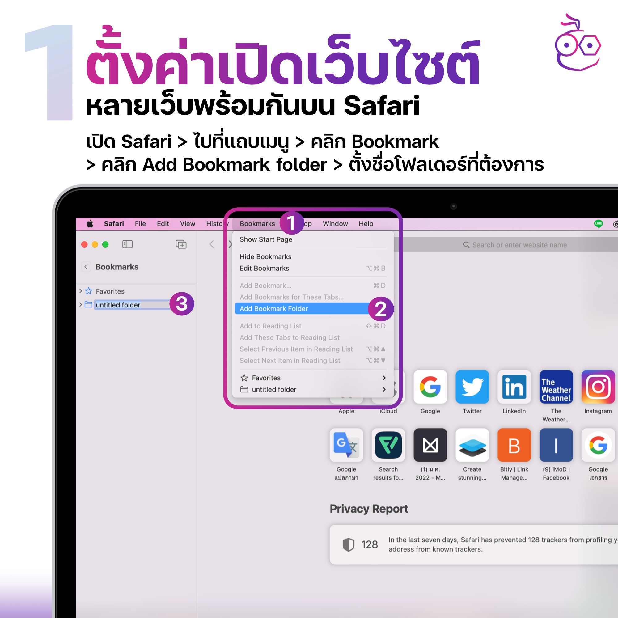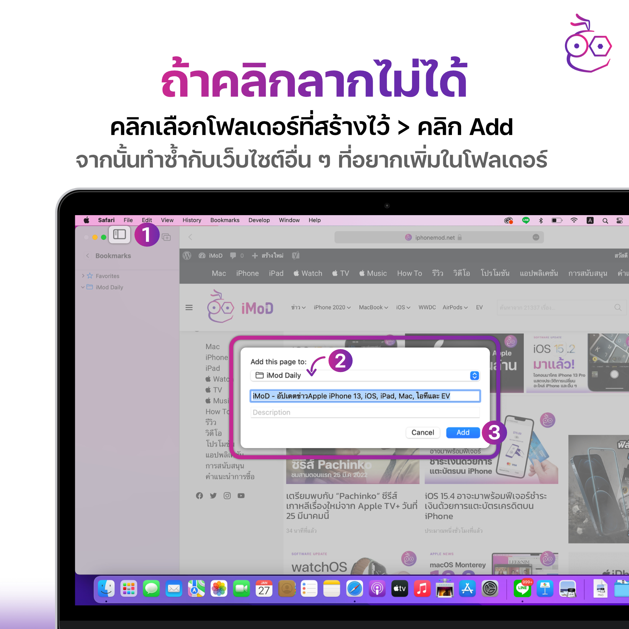 1. เปิด Safari ไปที่แถบเมนูด้านบน แล้วคลิกที่ Bookmark > คลิกที่ Add Bookmark folder > ตั้งชื่อโฟลเดอร์ที่ต้องการ
