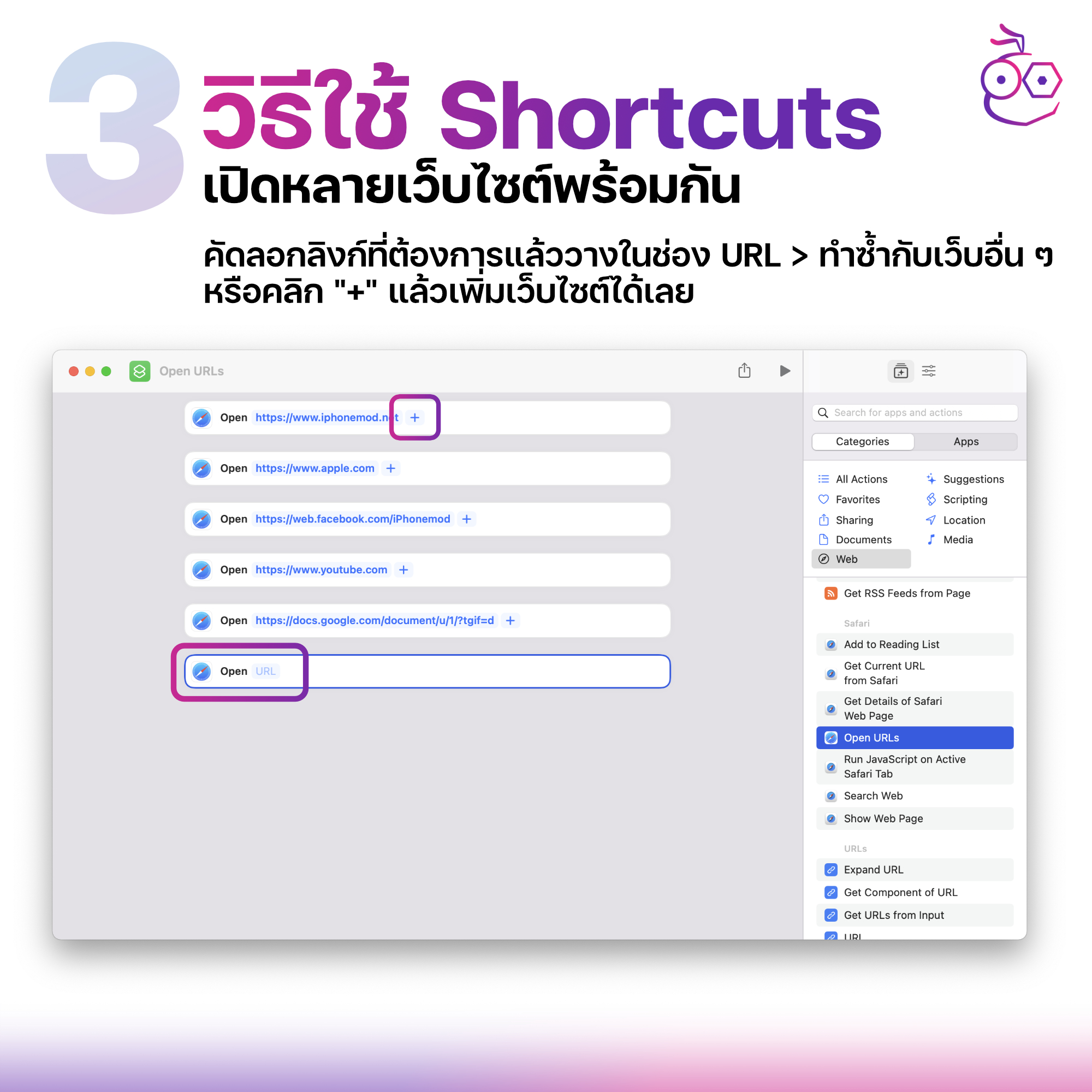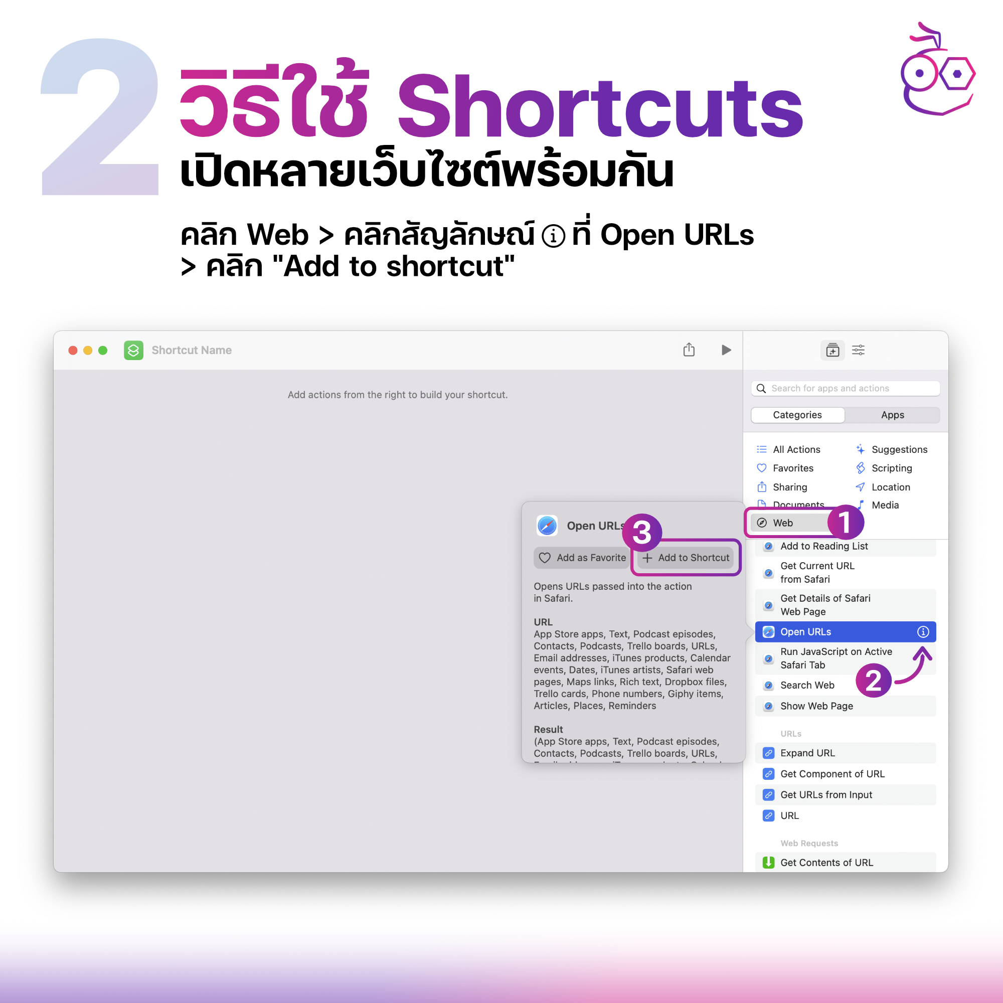 2. คลิก Web > คลิกสัญลักษณ์ (i) ที่ Open URLs > คลิก “Add to shortcut”