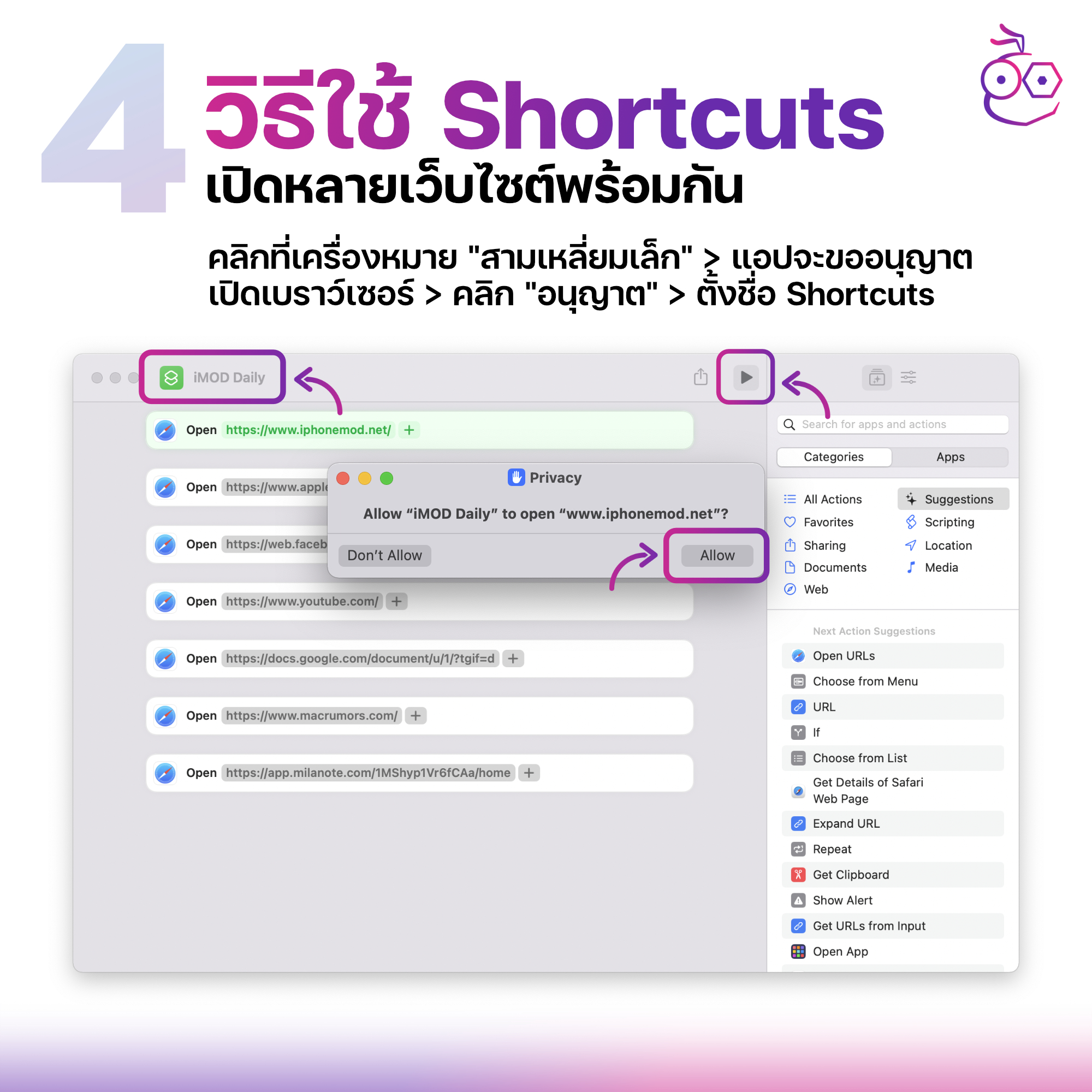 4. หากต้องการทดลองเปิดลิงก์ ให้คลิกที่เครื่องหมาย “สามเหลี่ยมเล็ก” > ตัวแอปจะขออนุญาตเพื่อเปิดเบราว์เซอร์ Mac เริ่มต้น คลิก “อนุญาต” > ตั้งชื่อคำสั่งลัดตามต้องการ