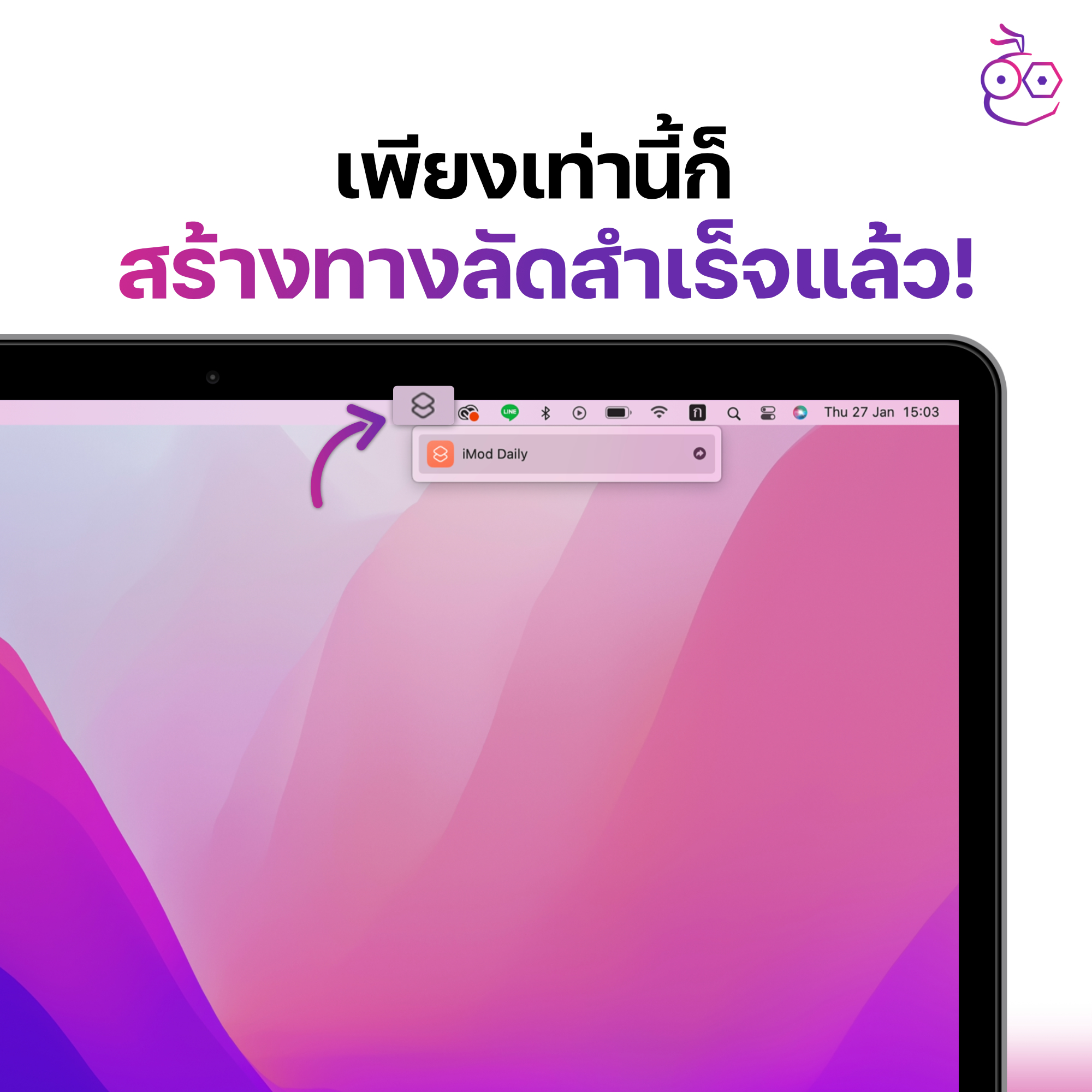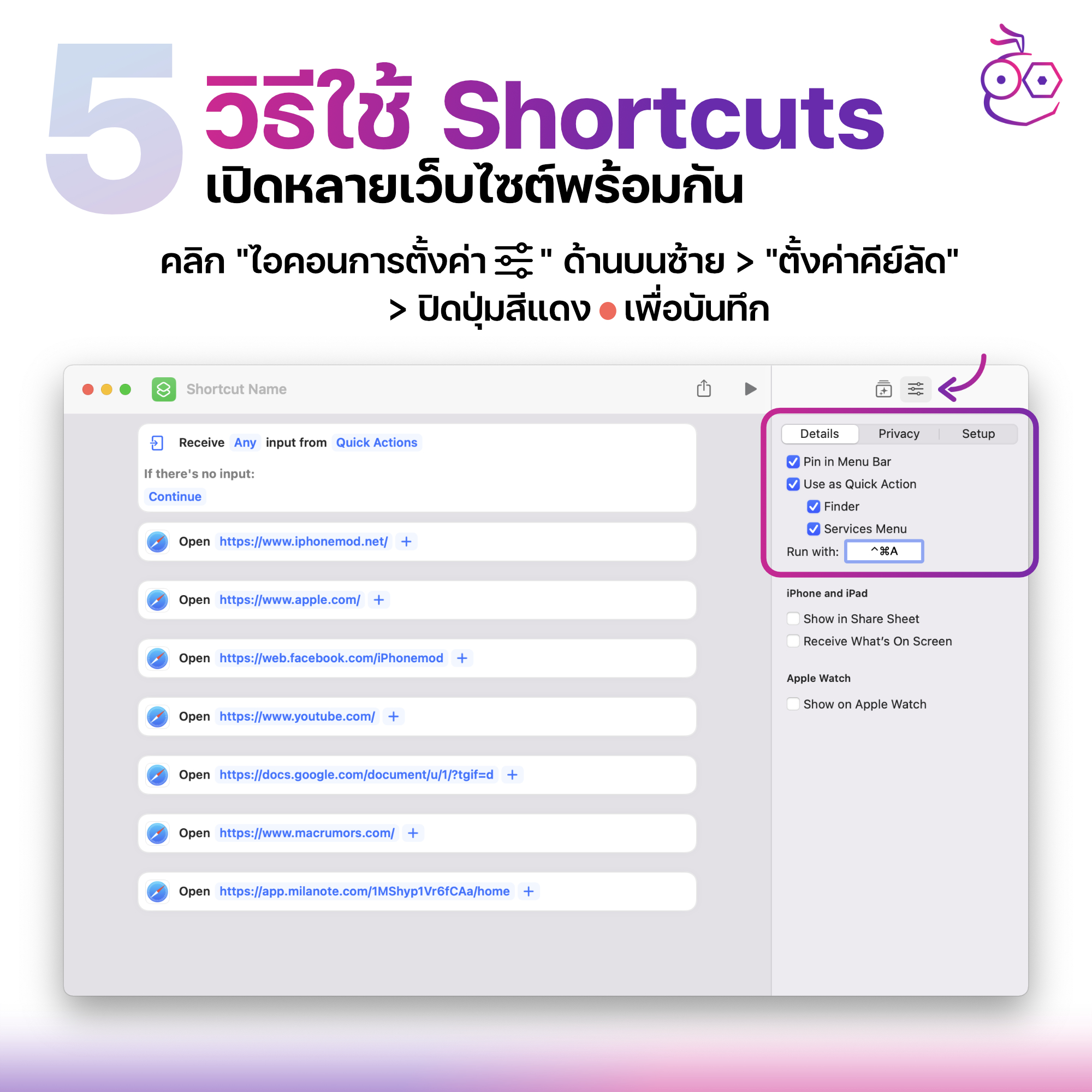 5. สามารถเลือกปักหมุดทางลัดในแถบเมนูด้านบนเป็นคำสั่งด่วน หรือเพิ่มลงใน Touch Bar, Finder และเมนูบริการ ด้วยการคลิกไอคอนการตั้งค่าบนซ้าย สามารถตั้งค่าคีย์ลัดได้ตามต้องการ แต่ต้องตรวจสอบให้แน่ใจว่าคีย์ลัดที่ตั้งค่าไม่ได้ดำเนินการคำสั่งอื่น ๆ อยู่