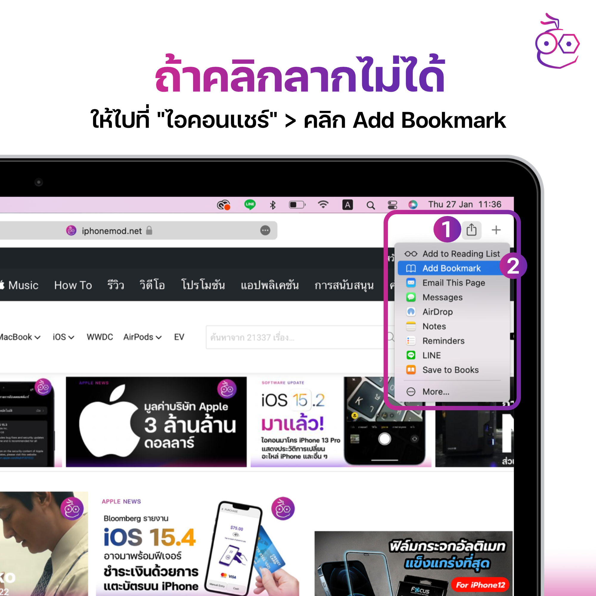 ถ้าคลิกลากไม่ได้ ให้ไปที่ ไอคอนแชร์ > คลิกที่ Add Bookmark