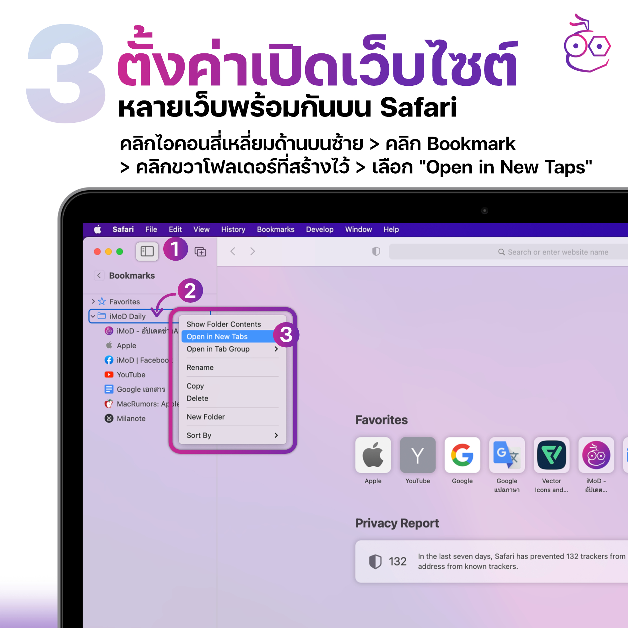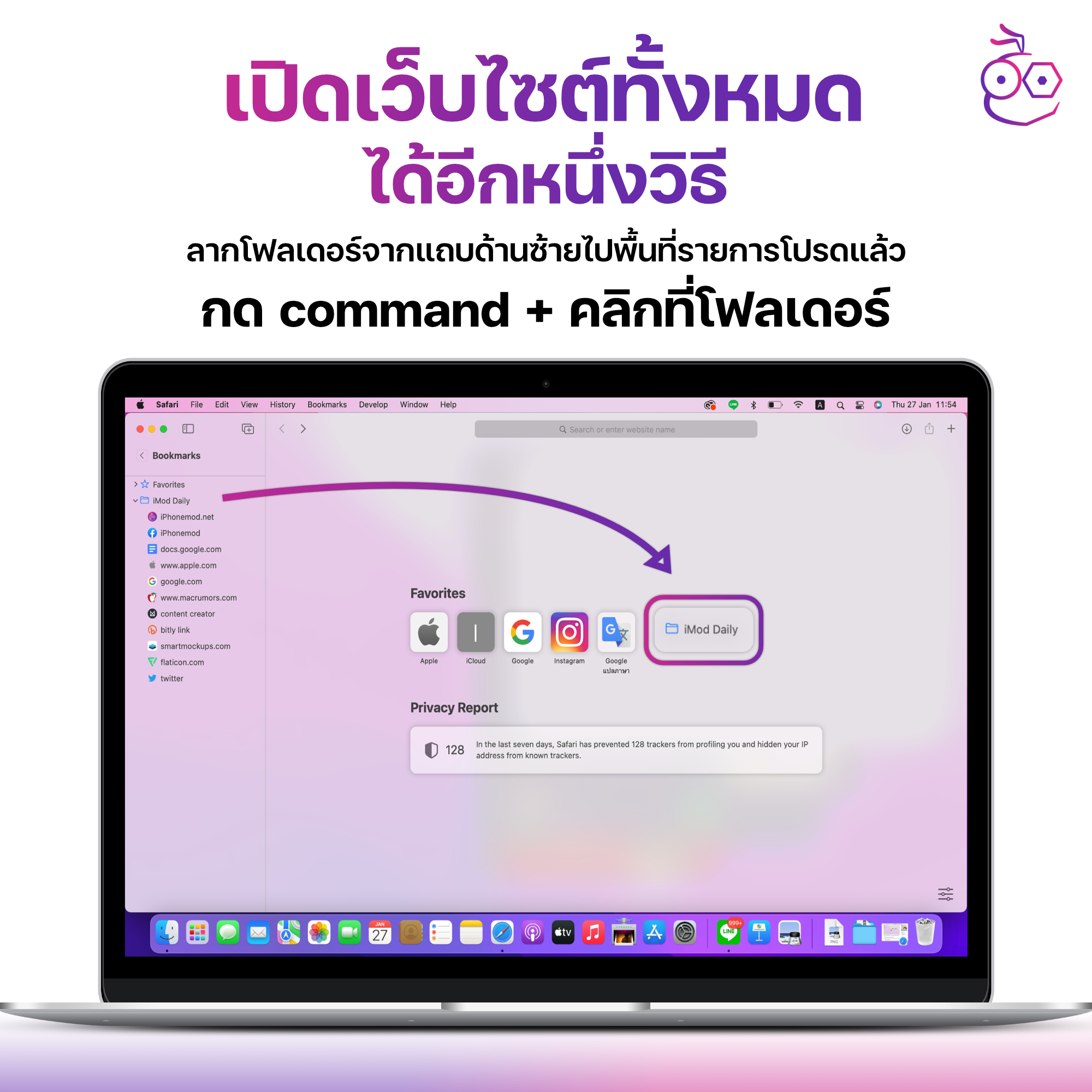 เปิดเว็บไซต์ทั้งหมดได้อีกหนึ่งวิธี ด้วยการลากโฟลเดอร์จากแถบด้านซ้ายไปยังพื้นที่รายการโปรด > คลิกขวาที่โฟลเดอร์ > เลือก “Open in New Taps” หรือ กด Command + คลิกที่โฟลเดอร์ เพียงเท่านี้เว็บไซต์ก็จะเปิดขึ้นมาทั้งหมดเลย