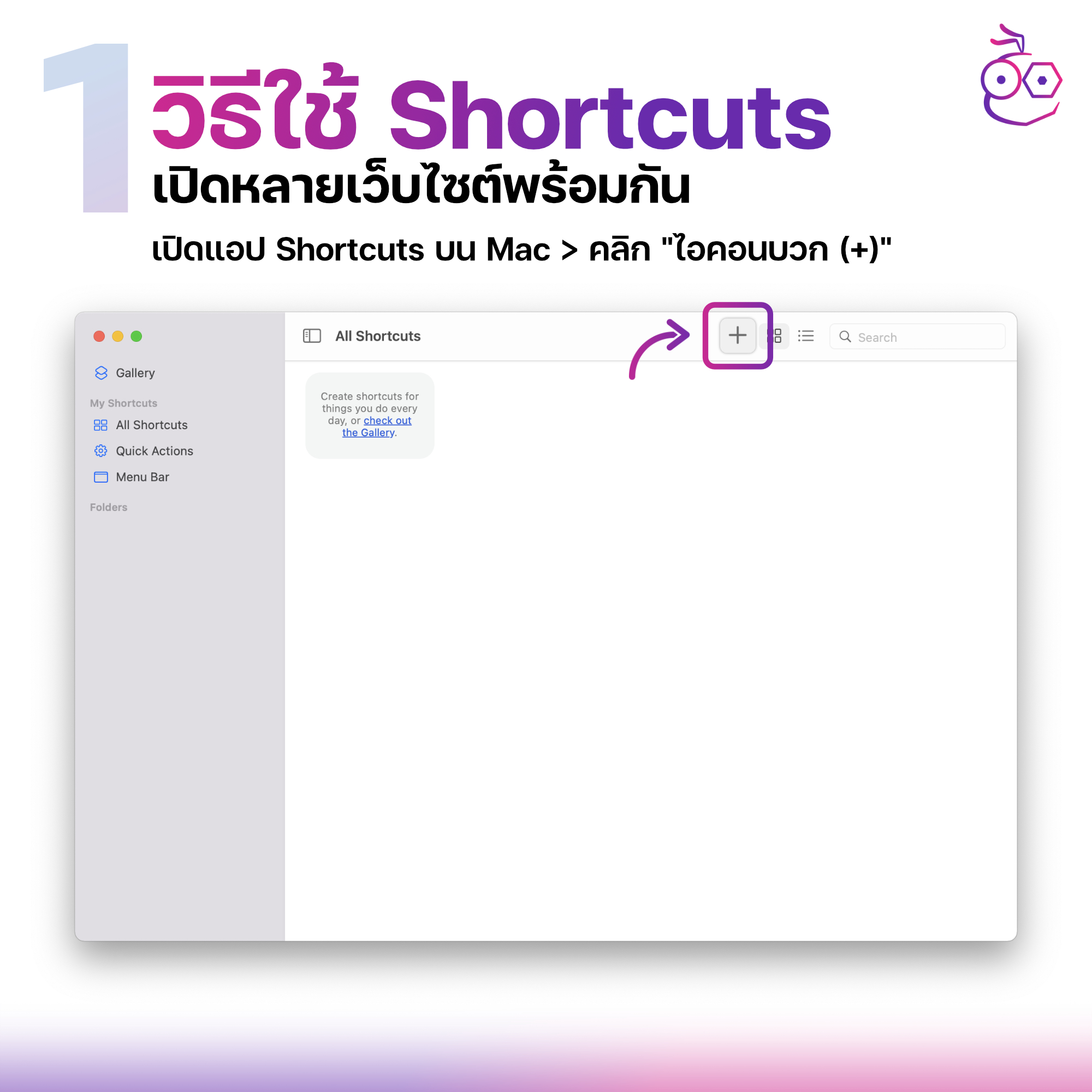 1. เปิดแอป Shortcuts บน Mac หรือ กด Command + Space Bar แล้วค้นหา Shortcuts > คลิก ไอคอนบวก