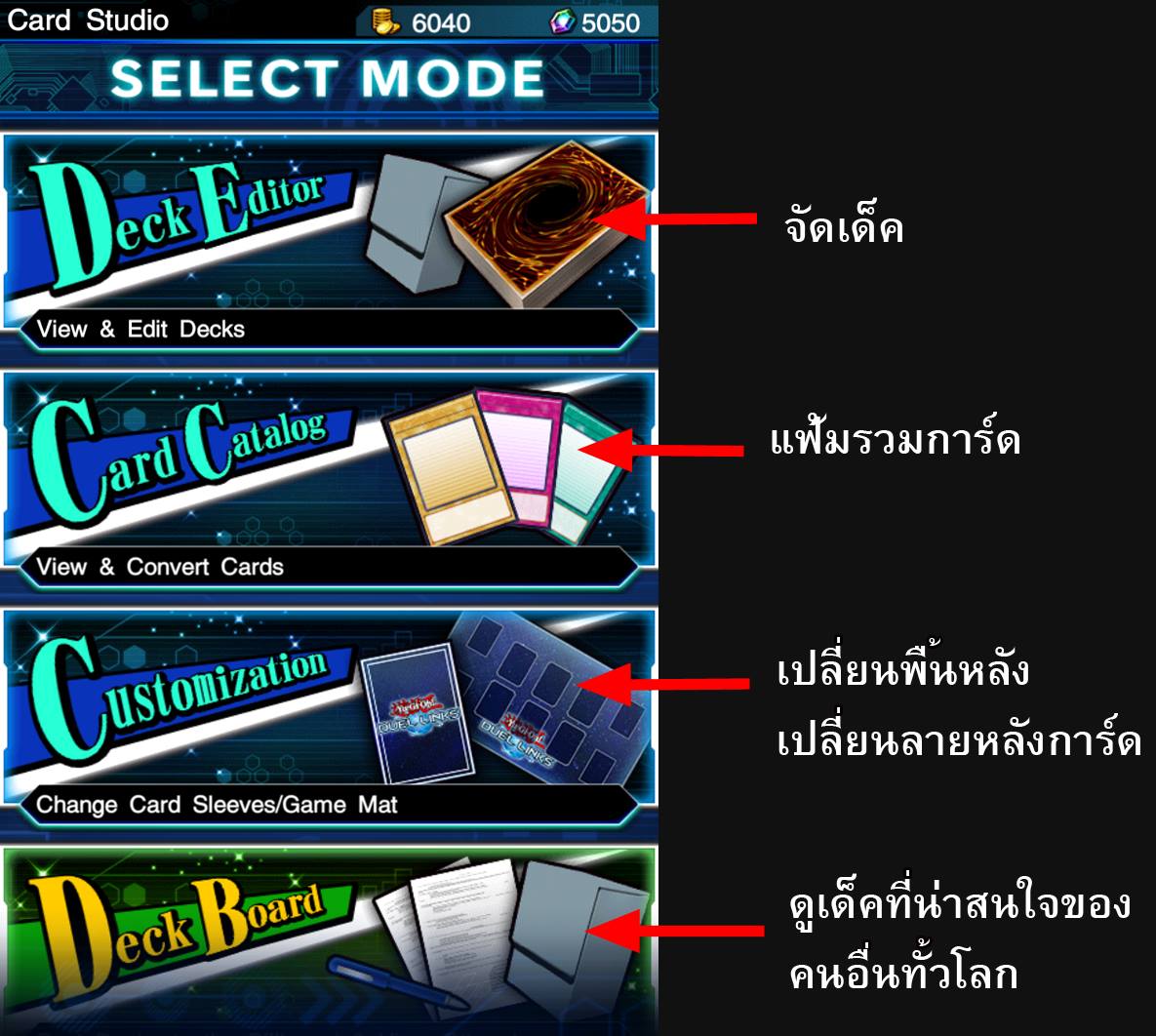 ตรงนี้สามารถจัดเด็คได้และดูการ์ดทั้งหมด รวมถึงเปลี่ยนพื้นหลังเล่นเล็ก ๆ น้อย ๆ เพื่อสร้างความบันเทิงในการเล่น แต่ถ้าหากใครไม่มีไอเดียก็สามารถดู Deck Board เพื่อลอกการ์ดชาวบ้านได้ (ฮา)
