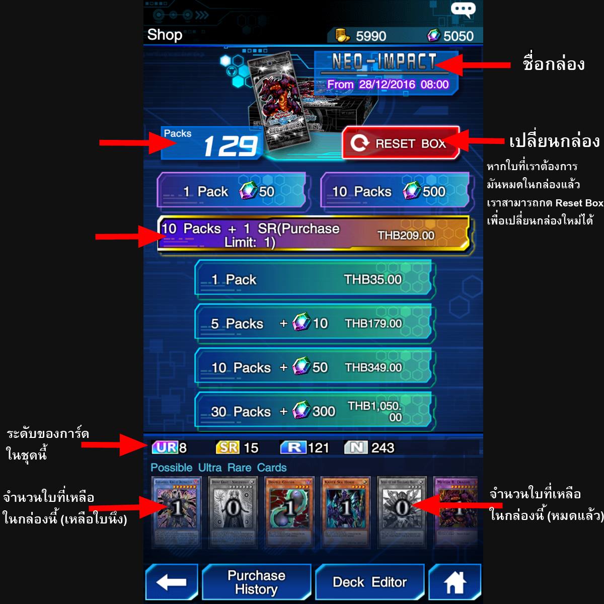 สิ่งที่ใช้ซื้อคือเพชรในเกม (หาได้จากในเกม, หรือจ่ายเงินซื้อเอา) แต่ละซองมีการ์ด 3 ใบ
