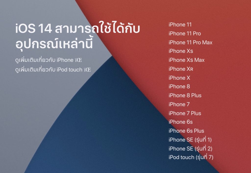 ก่อนอื่นให้เราเช็คก่อนว่าอุปกรณ์ที่รองรับ iOS 14 และ iPadOS นั้นมีอะไรบ้าง [เช็คทุกอุปกรณ์ได้ที่นี่]