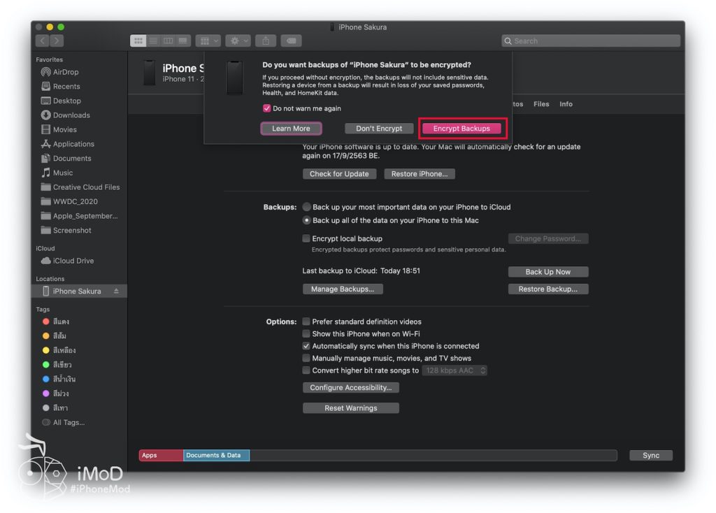 คลิกเลือก Encrypt Backups (ถ้าเช็คเลือกตั้งแต่หน้าจอบน จะไม่แสดงหน้าต่างนี้)
