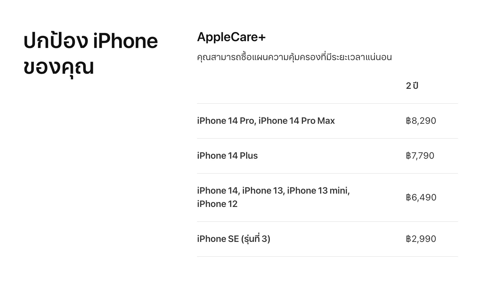 แต่ในกรณีที่เราซื้อความคุ้มครอง Apple Care+ ที่ขยายระยะเวลาคุ้มครองเป็น 2 ปี นับจากวันที่เราซื้อ AppleCare+ และเพิ่มความคุ้มครองด้านความเสียหายจากอุบัติเหตุสูงสุด 2 ครั้งในทุก ๆ 12 เดือน โดยแต่ละครั้งมีค่าธรรมเนียมการให้บริการ 1,000 บาท สำหรับความเสียหายกับหน้าจอหรือกระจกด้านหลังตัวเครื่อง หรือ 3,300 บาท สำหรับความเสียหายอื่น ๆ เช่น เครื่องตกน้ำ เครื่องเสียหายจากของเหลว เครื่องเสียหายจากอุบัติเหตุ