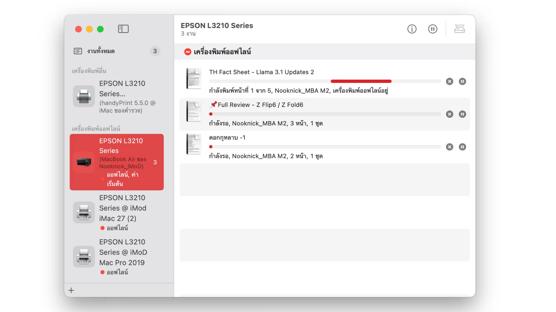 เมื่อคุณตั้งค่าทุกอย่างเรียบร้อยแล้ว ให้คลิกปุ่ม พิมพ์ (Print) เพื่อเริ่มการพิมพ์ได้เลย และเมื่อสั่งพิมพ์แล้วจะมีหน้าต่าง “ศูนย์การพิมพ์” เด้งขึ้นมา คุณสามารถดูลำดับการพิมพ์ หรือสั่งยกเลิกการพิมพ์ได้ที่หน้านี้
