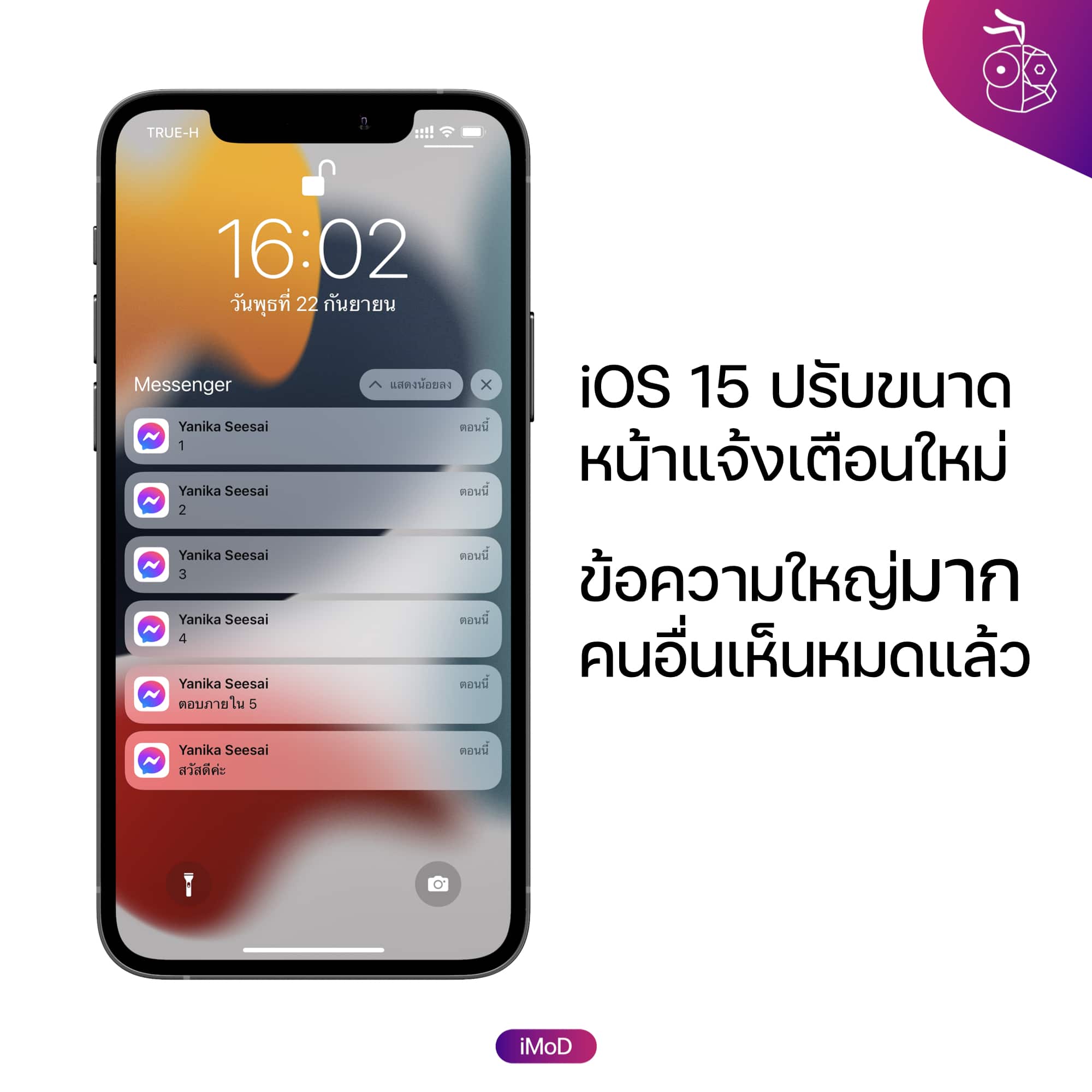 ในหน้าจอล็อกของ iOS 15 นั้นมีการปรับดีไซน์รูปแบบการแจ้งเตือนใหม่ โดยขนาดข้อความการแจ้งเตือนใหญ่ขึ้น ซึ่งบางคนอาจไม่ชอบ เพราะไม่อยากให้คนอื่นเห็นชัด