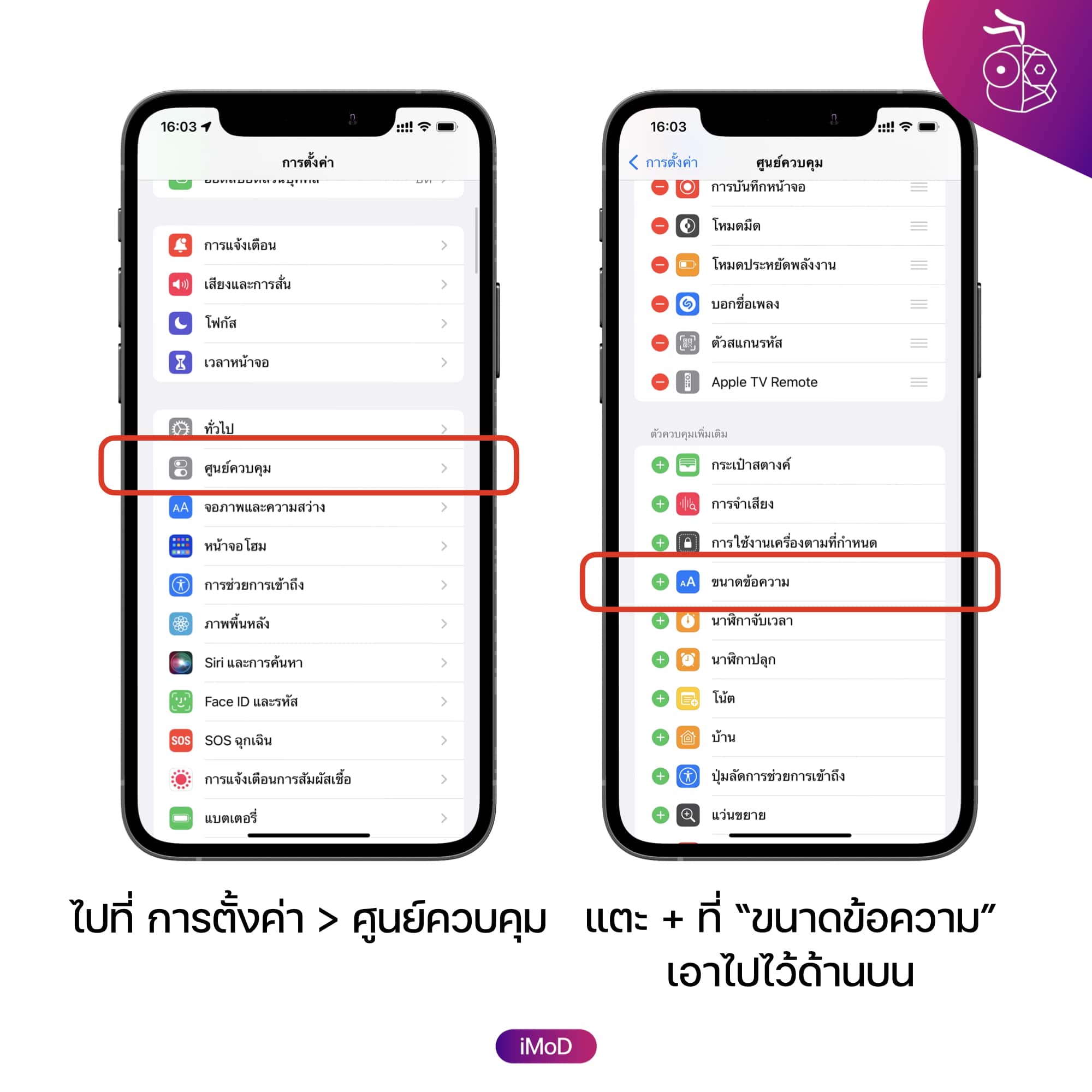 สำหรับวิธีการแก้เบื้องต้นนั้นจะใช้การตั้งค่าการปรับขนาดข้อความ โดยเอาเมนูตั้งค่านั้นมาไว้ที่ Control Center เพื่อให้เลื่อนปรับขนาดข้อความได้ง่ายขึ้น