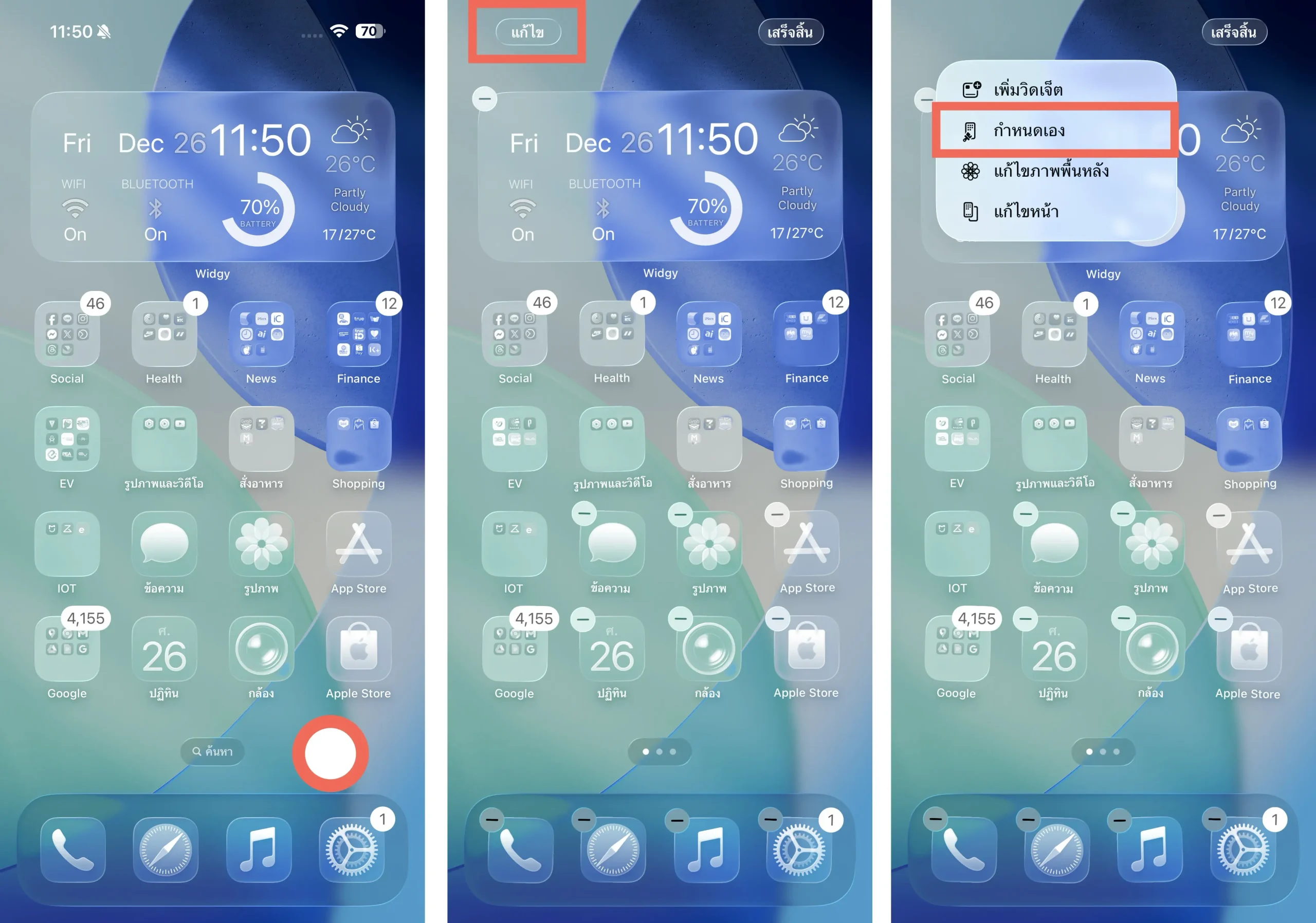 แตะ หน้าจอโฮมค้างไว้ > แตะ แก้ไข > แตะ กำหนดเอง
