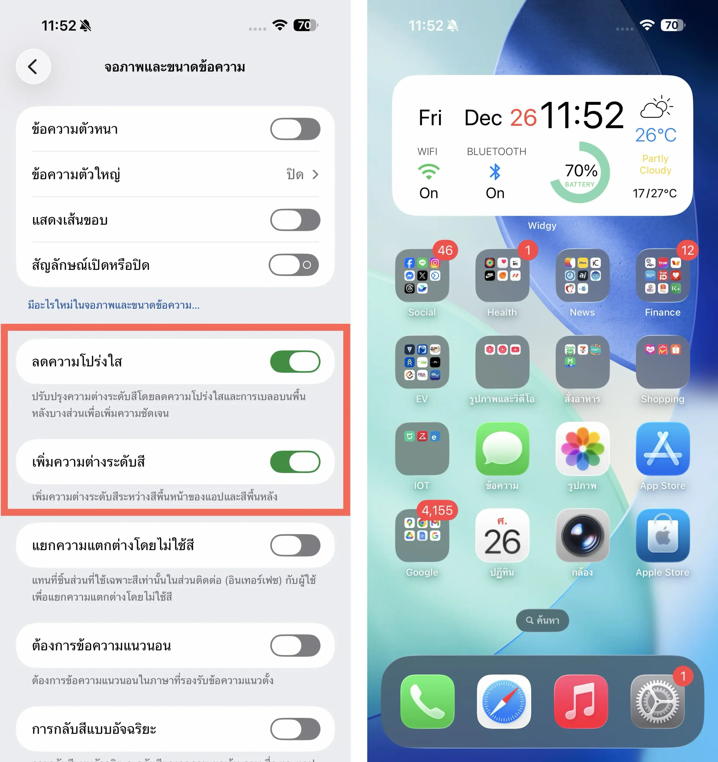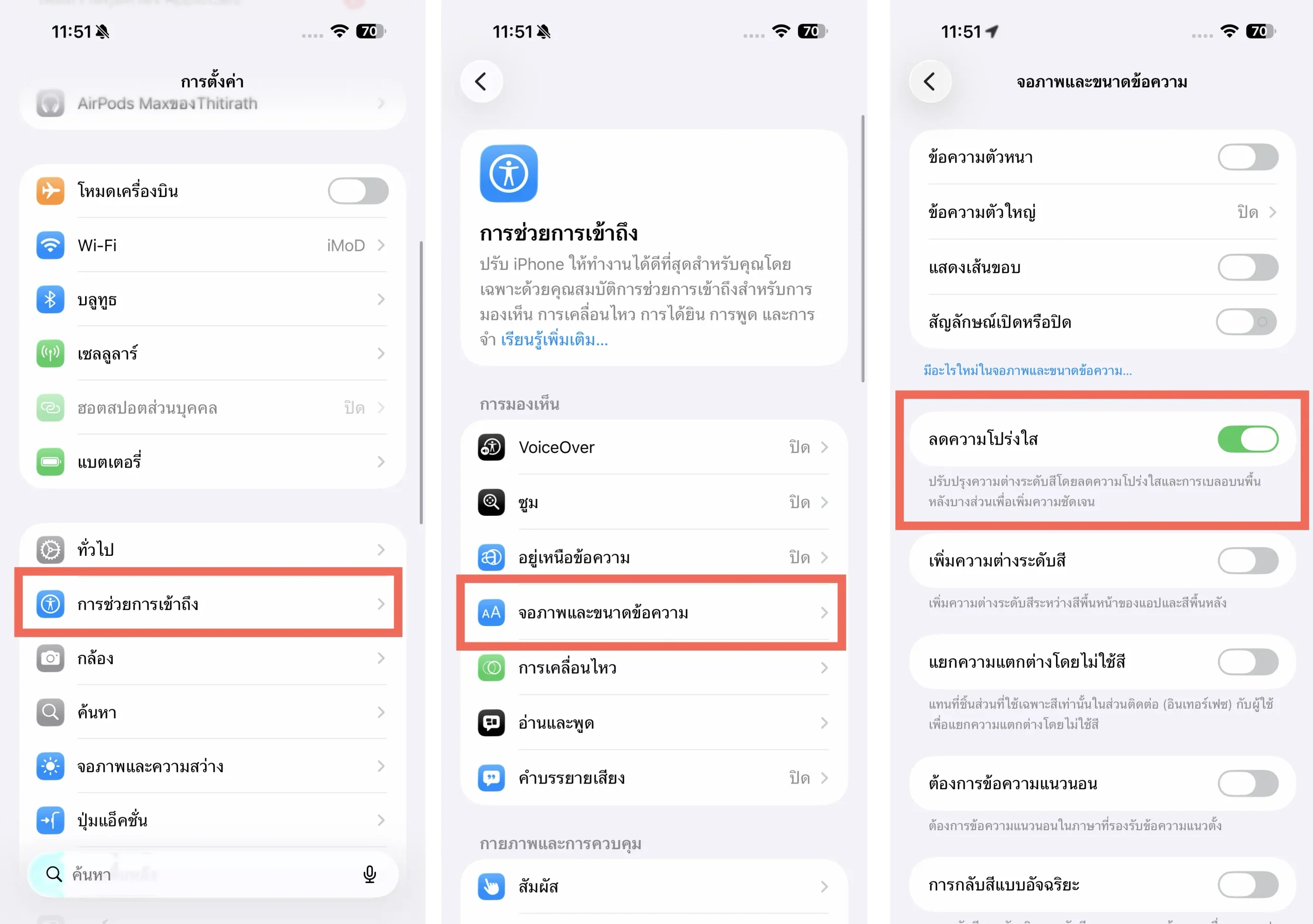 ไปที่การตั้งค่า > การช่วยการเข้าถึง > จอภาพและขนาดข้อความ > เลื่อนเปิด ลดความโปร่งใส