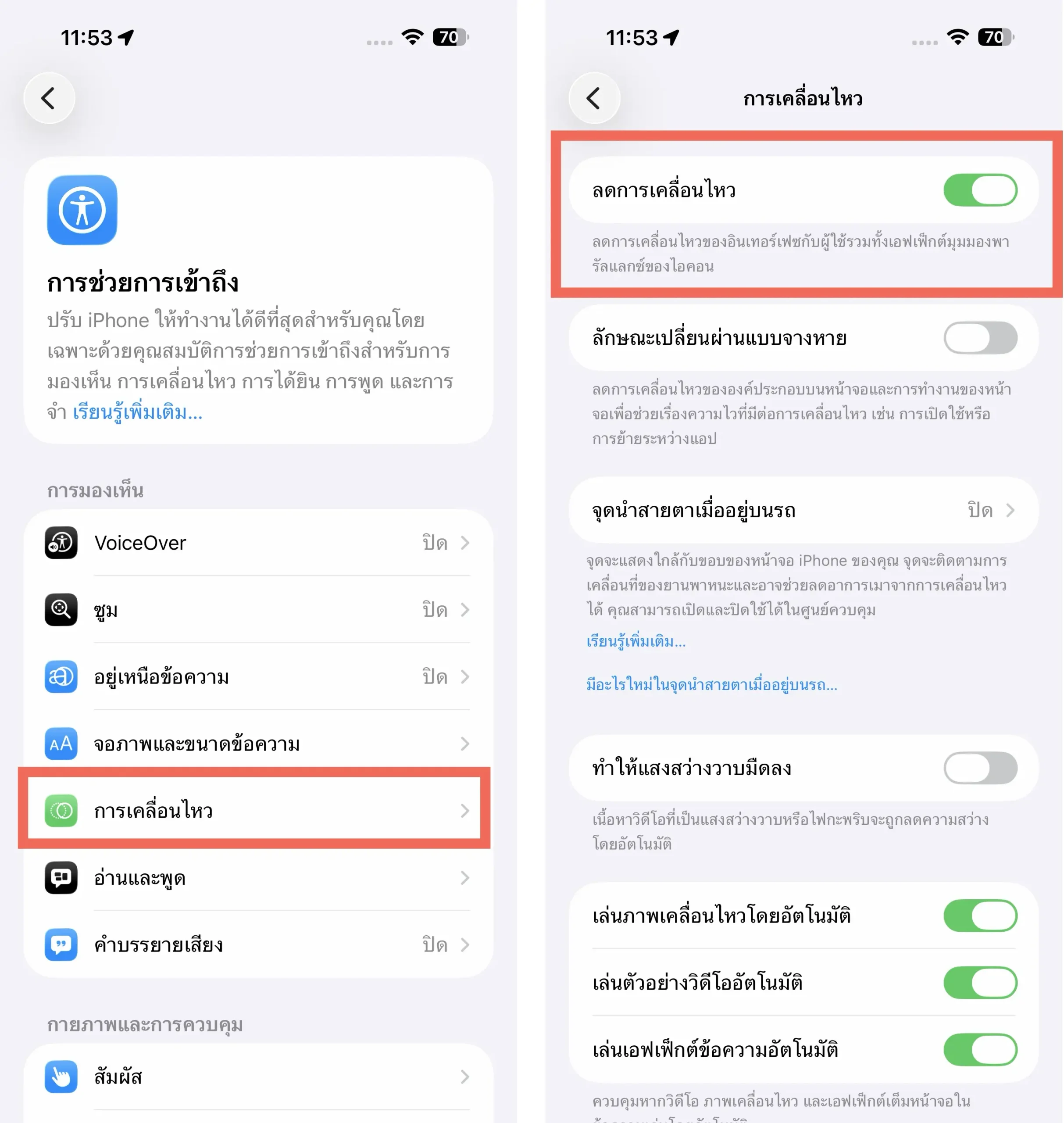 ไปที่การตั้งค่า > การช่วยการเข้าถึง > การเคลื่อนไหว > เลื่อนเปิด ลดการเคลื่อนไหว