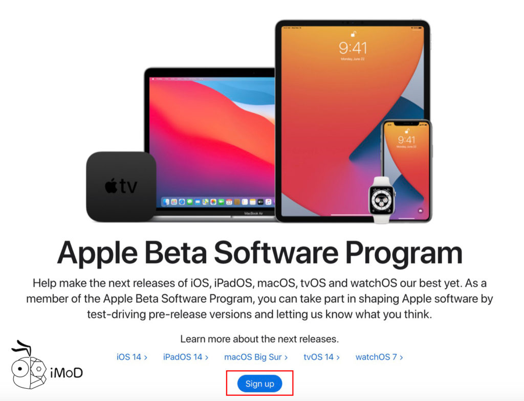 ไปที่เว็บไซต์ https://beta.apple.com (เปิดด้วยแอป Safari บน Mac, iPhone หรือ iPad) > กดปุ่ม Sign Up