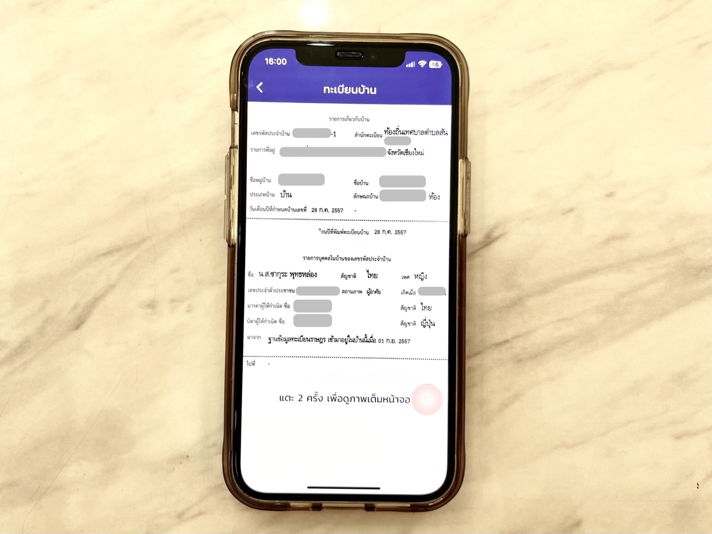 เมื่อเลือกทะเบียนบ้าน เราก็จะเห็นข้อมูลทะเบียนบ้านของเราบนมือถือ