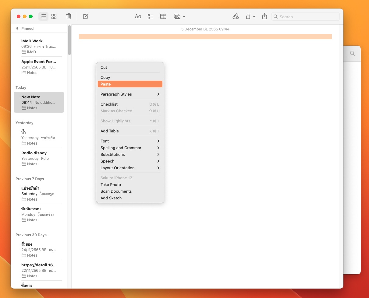 จากนั้นก็เปิดแอปอื่น ๆ เช่น แอปโน้ต ข้อความ ดังตัวอย่างเปิดแอปโน้ต > คลิกขวา แล้วเลือก Paste