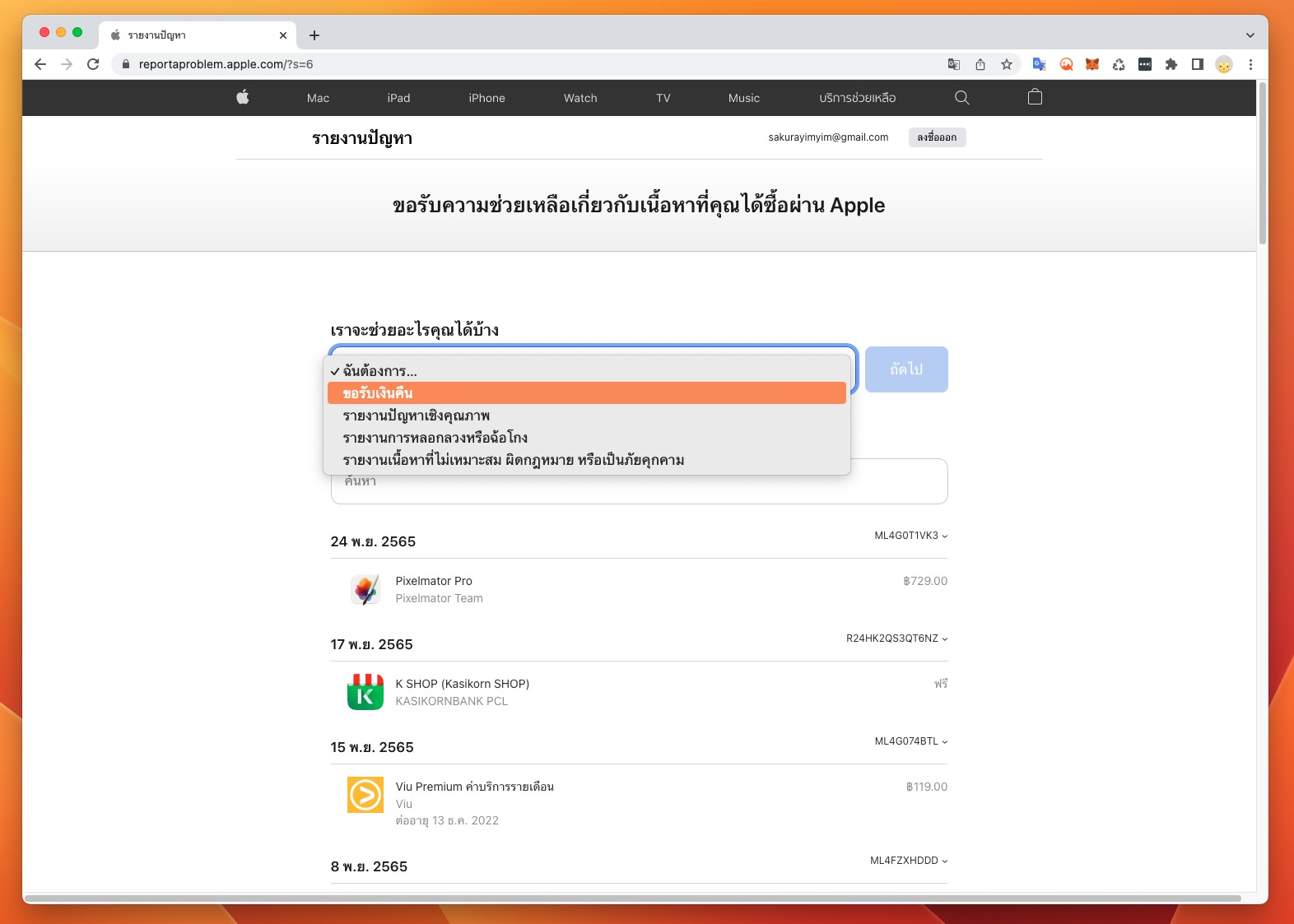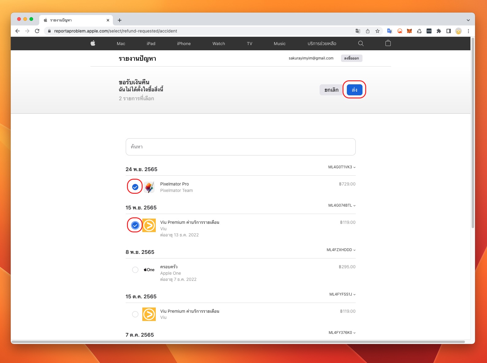 เลือกแอป เนื้อหา หรือบริการที่เราต้องการขอเงินคืน > คลิก ส่ง