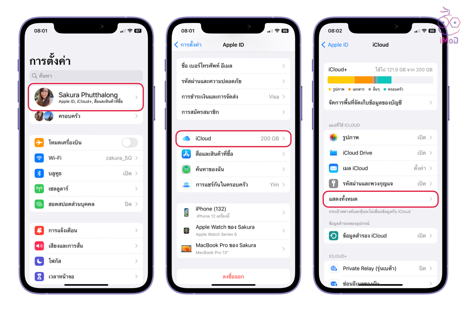 ไปที่ การตั้งค่า (Settings) > iCloud > แตะ แสดงทั้งหมด