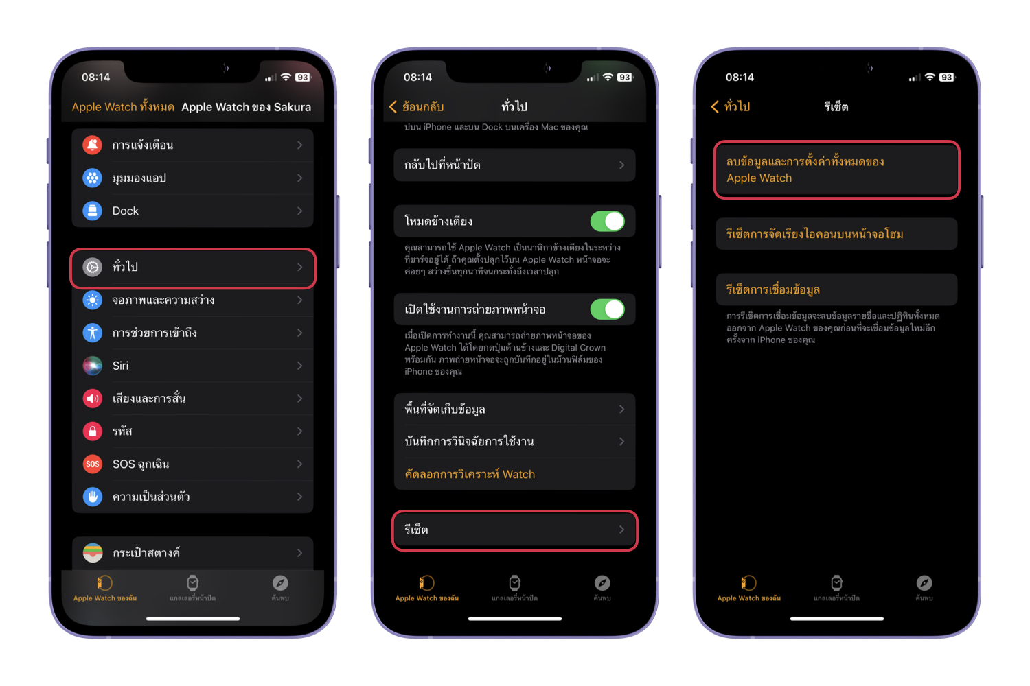 ไปที่แอป Watch > ทั่วไป (General) > รีเซ็ต (Reset) > ลบข้อมูลและการตั้งค่าทั้งหมดของ Apple Watch (Erase Apple Watch Content and Settings)