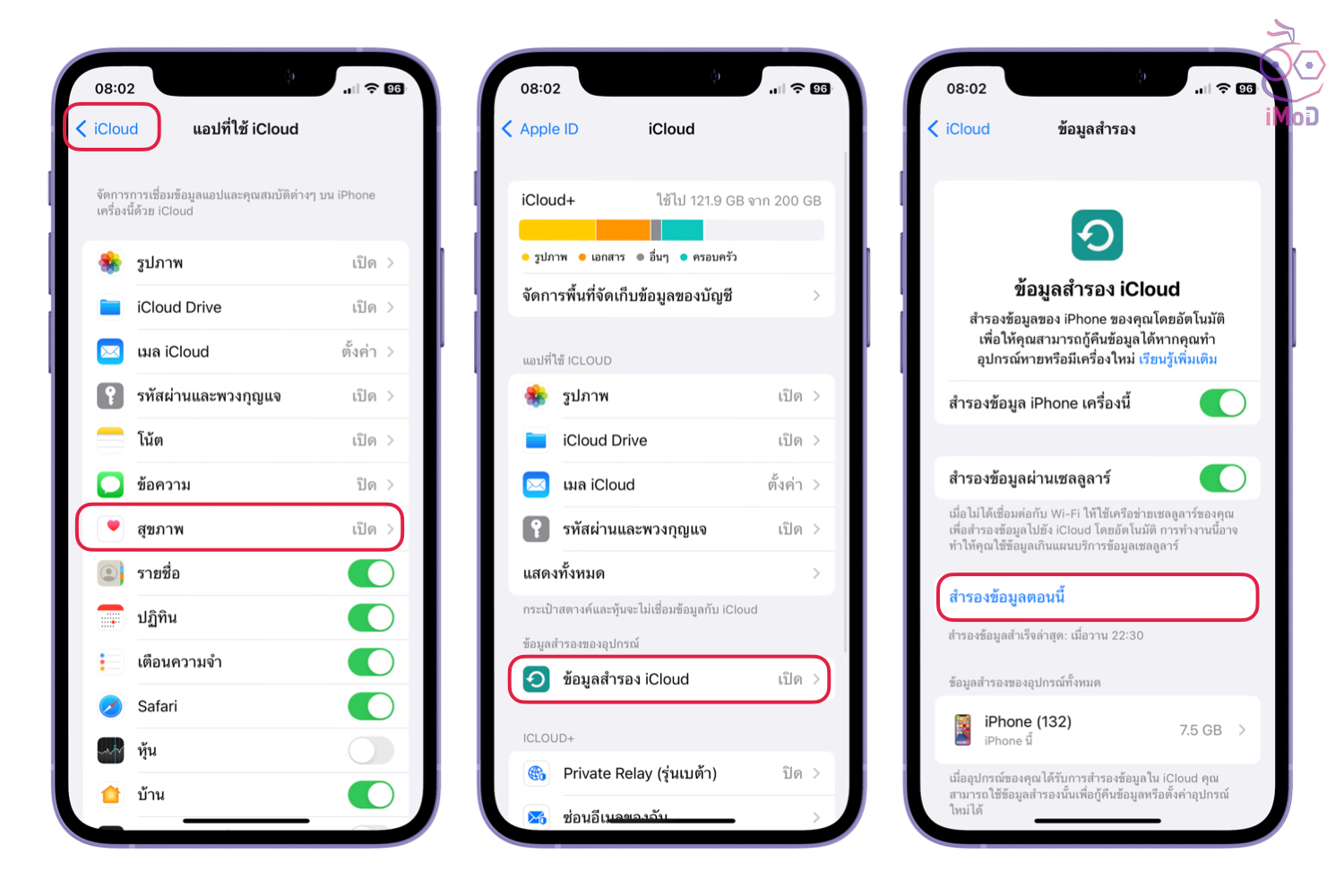 ให้ตรวจสอบก่อนว่า ข้อมูลสุขภาพได้เปิดใช้งาน iCloud หรือไม่ ถ้ายังไม่ได้เปิด ให้ทำการเปิดใช้งานให้เรียบร้อยก่อน เพื่อสำรองข้อมูลสุขภาพด้วย เมื่อเปิดใช้งานแล้วให้แตะกลับที่ iCloud ด้านบน > เลือก ข้อมูลสำรอง iCloud (iCloud Backup) > แตะ สำรองข้อมูลตอนนี้ (Back up Now) จากนั้นก็รอให้ iPhone สำรองข้อมูลให้เรียบร้อย