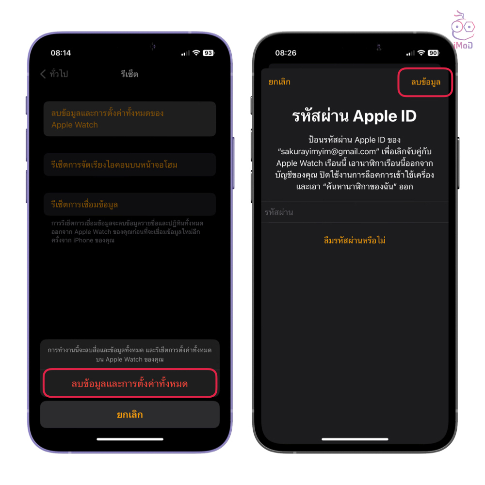 วิธีนี้ก็จะคล้าย ๆ กับวิธีด้านบน แต่เราจะใช้การลบข้อมูลเนื้อหาและการตั้งค่า จากนั้นเครื่องก็จะเลิกจับคู่กับ iPhone และเราก็ต้องทำการจับคู่ใหม่อีกครั้ง พร้อมตั้งรหัสผ่าน Apple Watch ใหม่