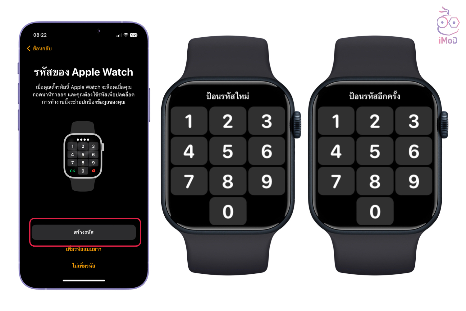 จนถึงการตั้งค่ารหัสผ่าน ให้เราตั้งรหัสผ่านใหม่ได้เลย โดยแตะสร้างรหัส และไปป้อนรหัสผ่านใหม่บน Apple Watch