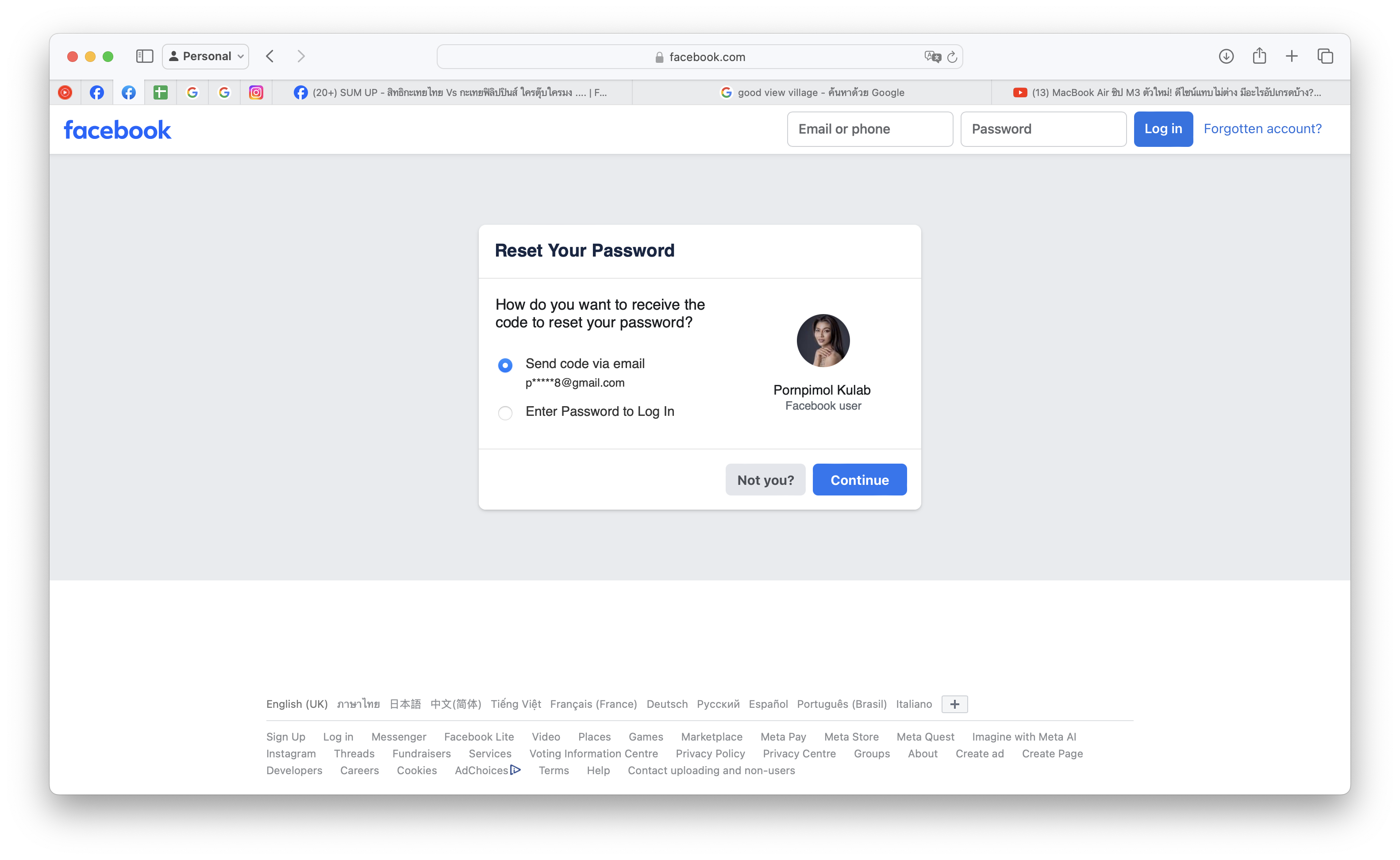 2. เลือกรับโค้ดผ่านอีเมลที่ลงทะเบียนบัญชี Facebook