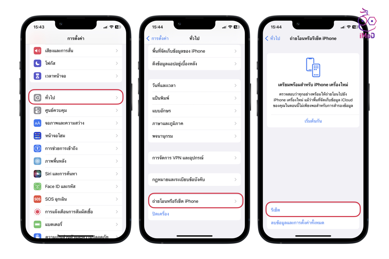 ไปที่ การตั้งค่า (Settings) > ทั่วไป (General) > ถ่ายโอนหรือรีเซ็ต iPhone (Transfer or Reset iPhone) > รีเซ็ต (Reset)