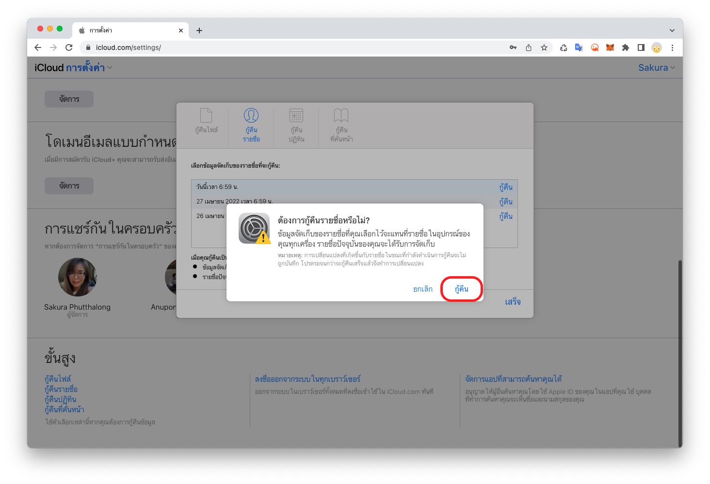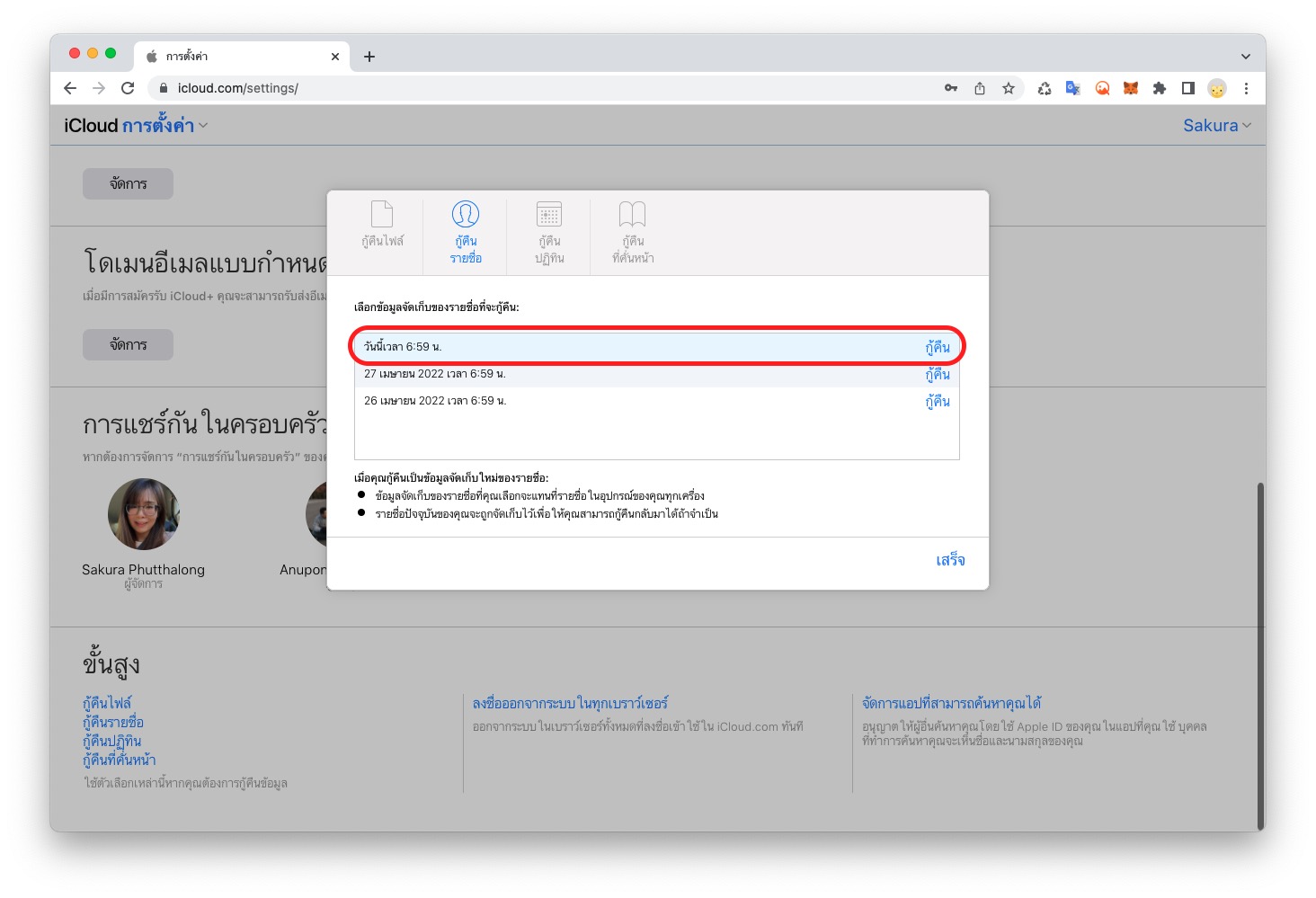 คลิกเลือก “กู้คืน” ข้อมูลจัดเก็บรายชื่อในวันที่ต้องการ
