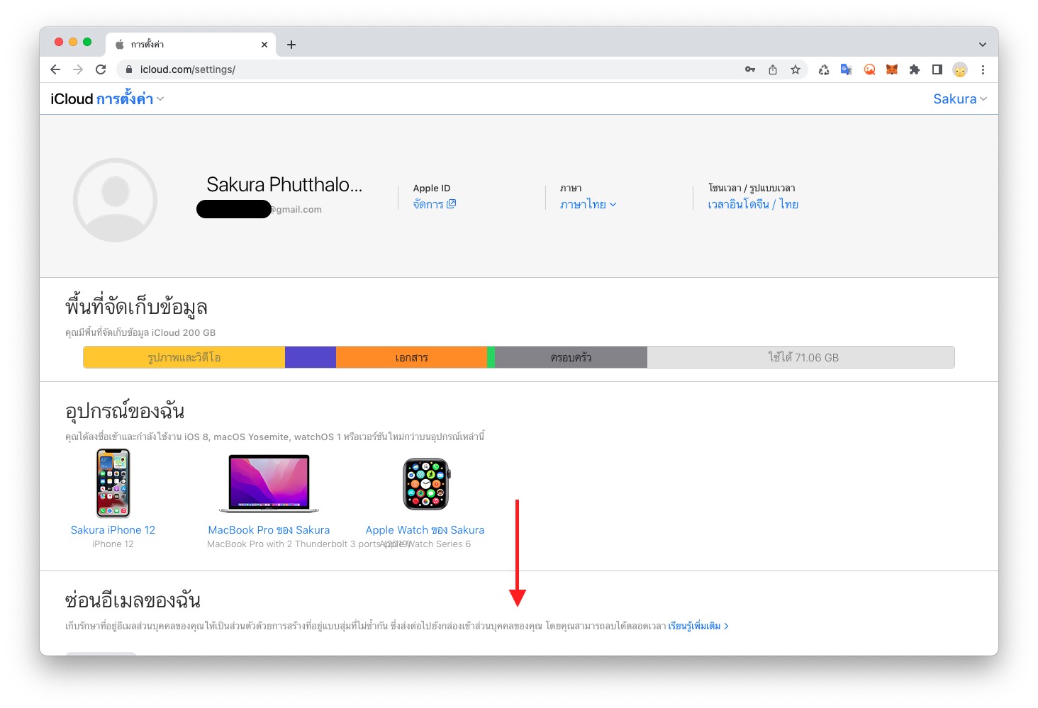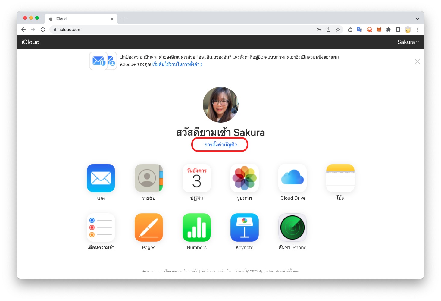 ไปที่เว็บไซต์ icloud.com แล้วลงชื่อเข้าใช้ Apple ID > เลือกเมนู การตั้งค่าบัญชี (Account Settings)