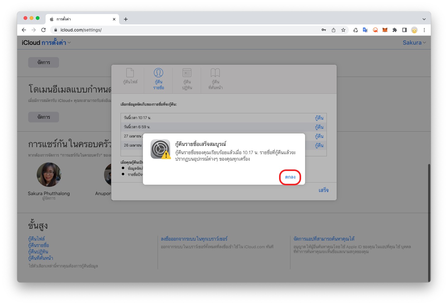 เมื่อกู้คืนเสร็จแล้ว ให้คลิก ตกลง