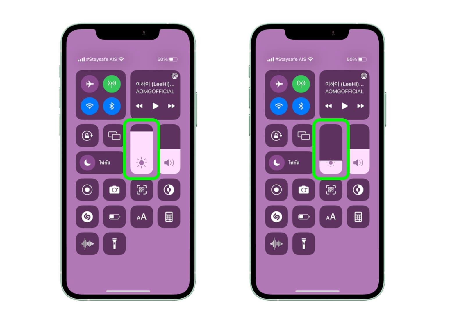 การหรี่แสงหน้าจอลงเป็นการลดการพลังงานให้น้อยลง หากต้องการหรี่แสงจอ ให้ปัดศูนย์ควบคุม (Control Center) ลงมา แล้วลากแถบเลื่อนความสว่างลงมาตามต้องการ
