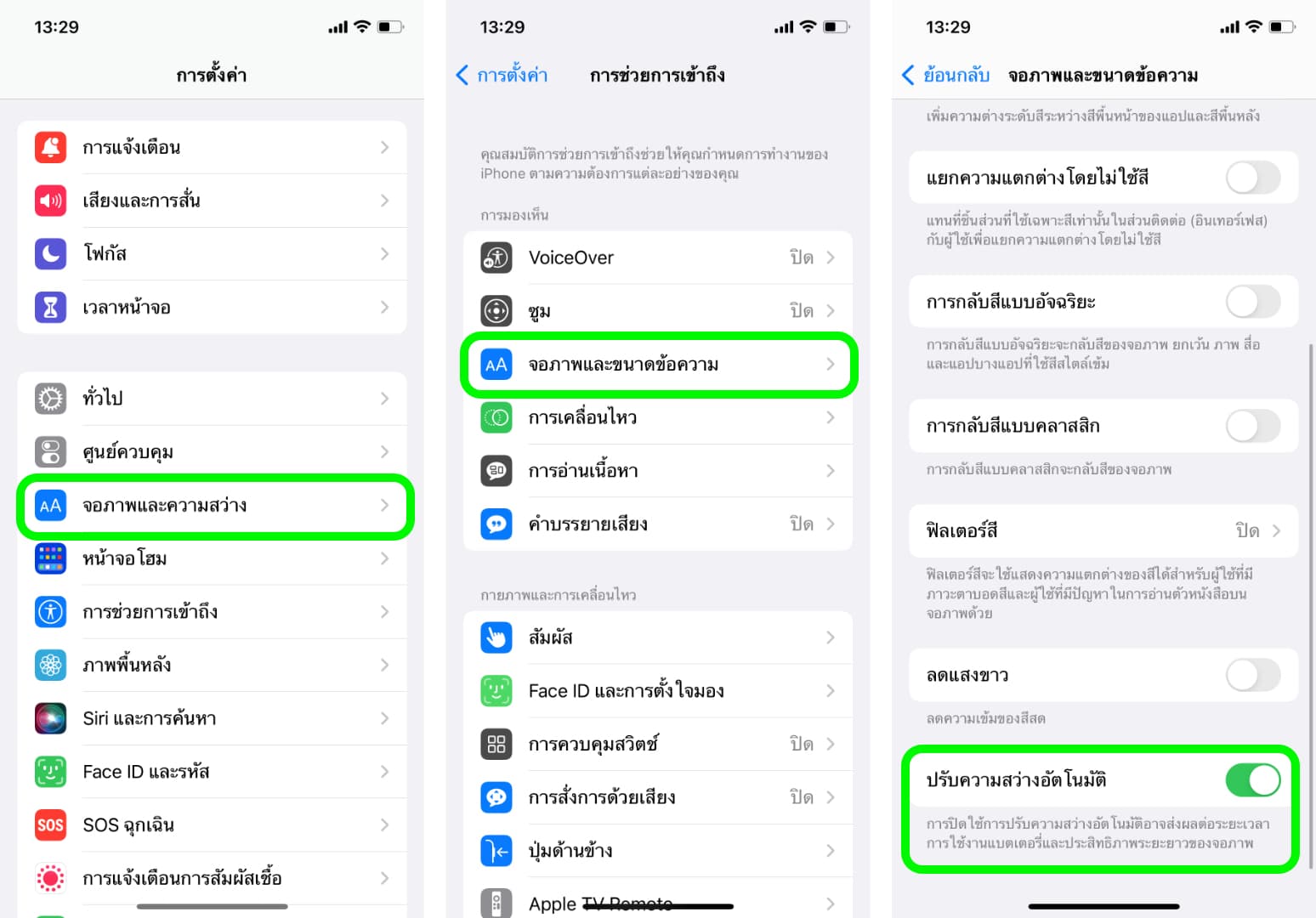 หากจะเปิดใช้งานให้ไปที่ การตั้งค่า > การช่วยการเข้าถึง > จอภาพและขนาดข้อความ > เปิด “ปรับความสว่างอัตโนมัติ”