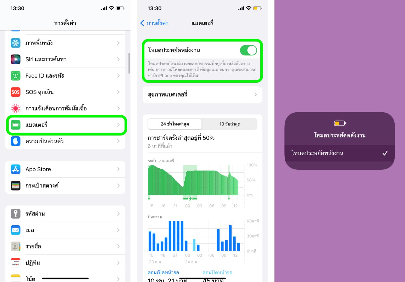 เข้าไปเปิดโหมดประหยัดพลังงานได้ที่ การตั้งค่า > แบตเตอรี่ > เปิด “โหมดประหยัดพลังงาน” เมื่อเปิดใช้งานแล้วแบตเตอรี่ที่แสดงด้านบนจะเปลี่ยนเป็นไอคอนแบตเตอรี่สีเหลือง