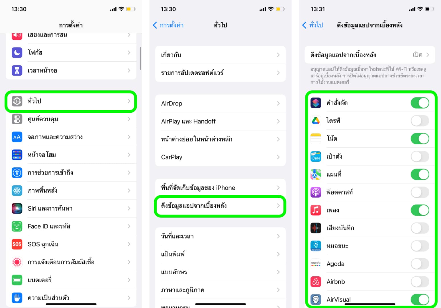 เข้าไปที่ การตั้งค่า > ทั่วไป > “ดึงข้อมูลแอปจากเบื้องหลัง” > เลือกปิดแอปที่ไม่จำเป็น