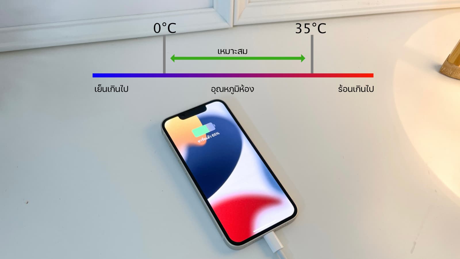 Apple บอกว่า อุปกรณ์ของเราได้รับการออกแบบมาให้ทำงานได้อย่างมีประสิทธิภาพในระดับอุณหภูมิที่อยู่ระหว่าง 16 ถึง 22 °C แต่ไม่เกิน 35 °C เพราะเมื่ออุณหภูมิโดยรอบสูงเกินไปหรือต่ำจนเกินไปก็จะสร้างความเสียหายอย่างถาวรให้กับความจุของแบตเตอรี่ ทำให้อายุแบตเตอรี่วั้นลงนั่นเอง