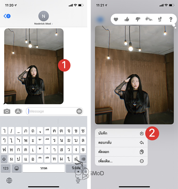 ไปที่แอปข้อความ (Message) และไปยังข้อความที่ต้องการบันทึกไฟล์ > แตะที่รูปภาพค้างไว้ > แตะบันทึก (Save) รูปภาพก็จะบันทึกไว้ในแอป Photos