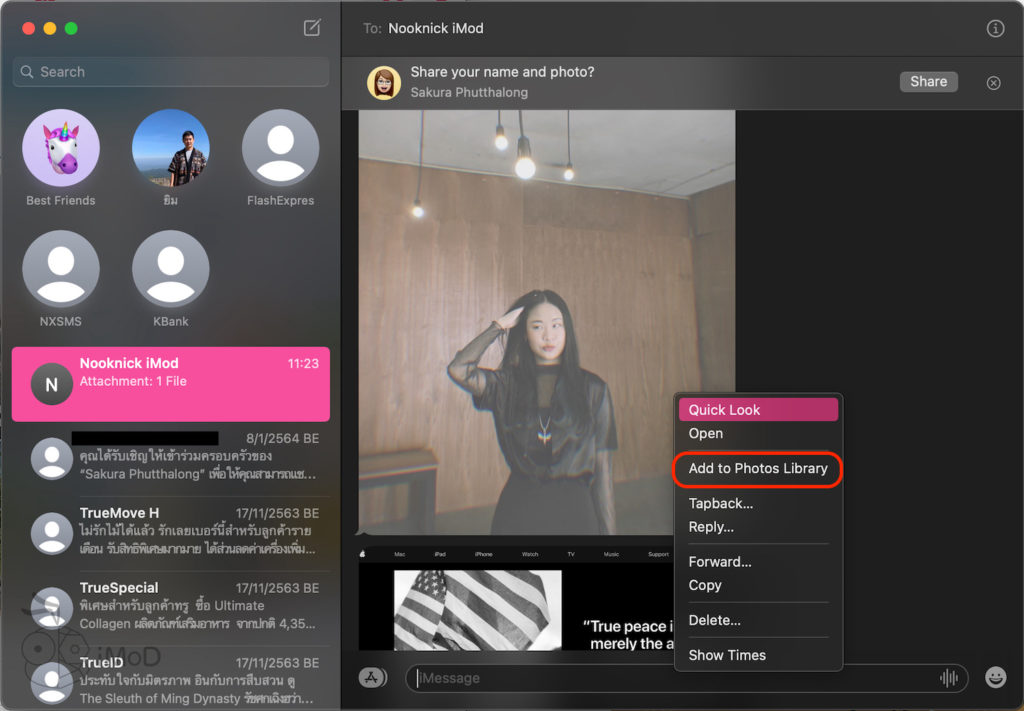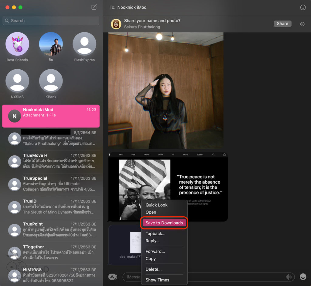 ส่วนใครที่ใช้งานแอปข้อความ (Message) บน Mac ด้วย ก็สามารถบันทึกรูปภาพหรือไฟล์เก็บไว้ในแอป Photos หรือเก็บไว้ในเครื่องได้เช่นกัน