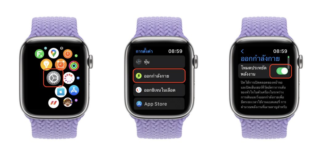 ไปที่ การตั้งค่า (Settings) > ออกกำลังกาย (Workout) > เปิดโหมดประหยัดพลังงาน (Power Saving Mode)