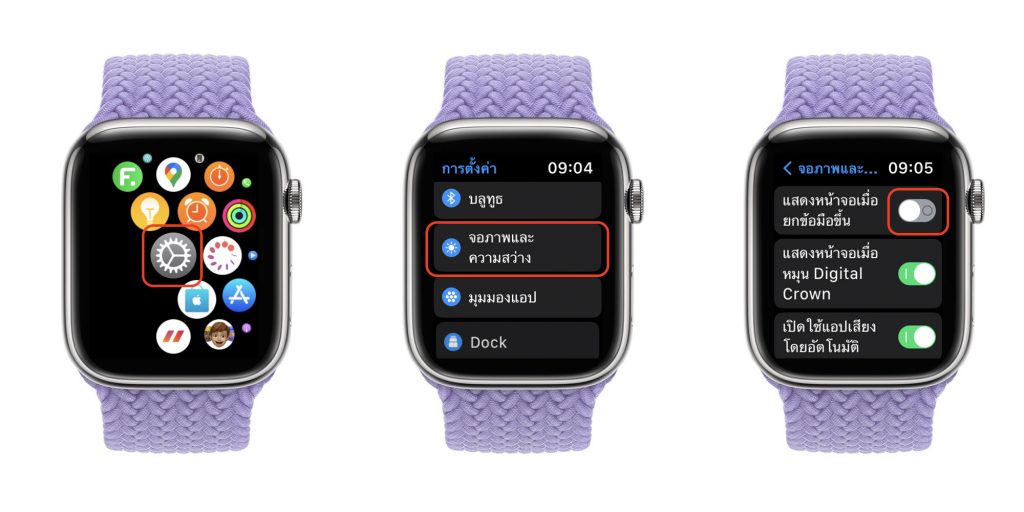 ปิดได้ที่ การตั้งค่า (Settings) > จอภาพและความสว่าง (Display & Brightness) > ปิด แสดงหน้าจอเพื่อยกข้อมือขึ้น (Wake on Wrist Raise)
