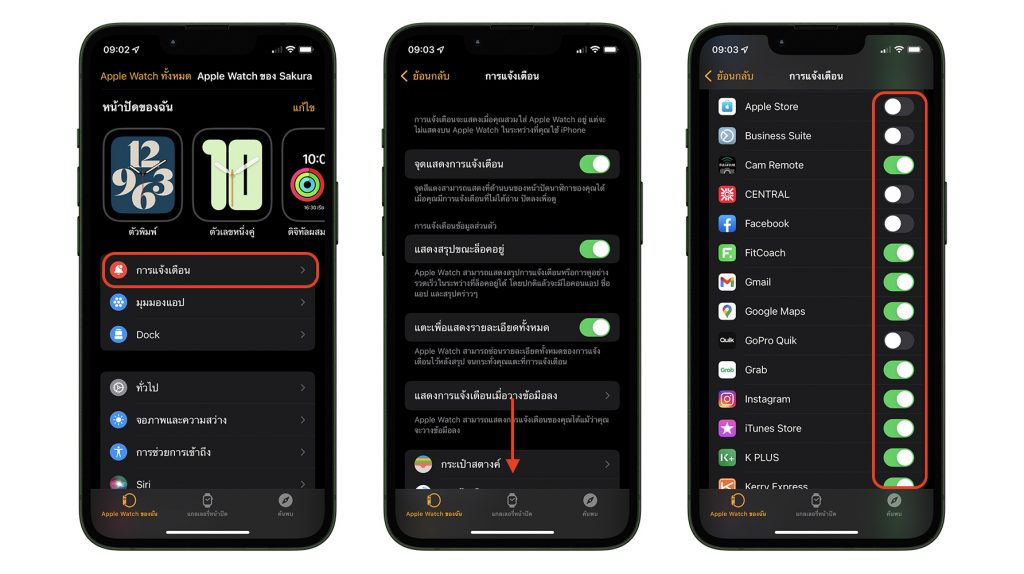 สามารถปิดได้ที่ แอป Watch บน iPhone > การแจ้งเตือน (Notification) > เลื่อนลงด้านล่าง > ปิดการแจ้งเตือนแอปที่เราไม่ต้องการติดตามตลอดเวลา