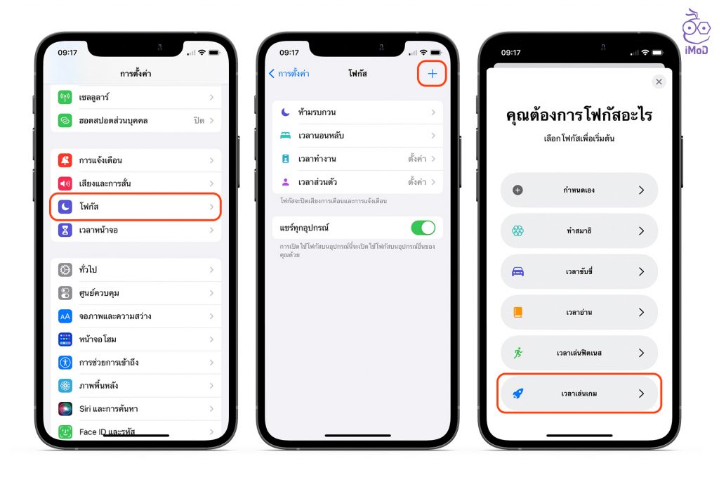 ไปที่การตั้งค่า (Settings) > โฟกัส (Focus) > แตะไอคอน + > เพิ่มโหมดโฟกัสที่ต้องการ ตัวอย่างเพิ่มเป็น เวลาเล่นเกม
