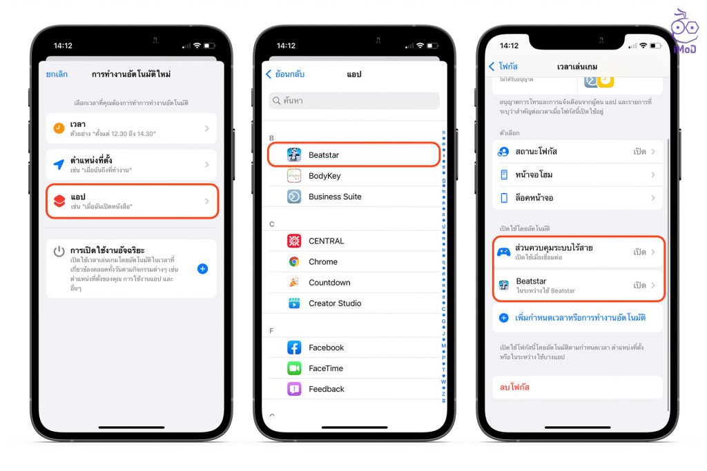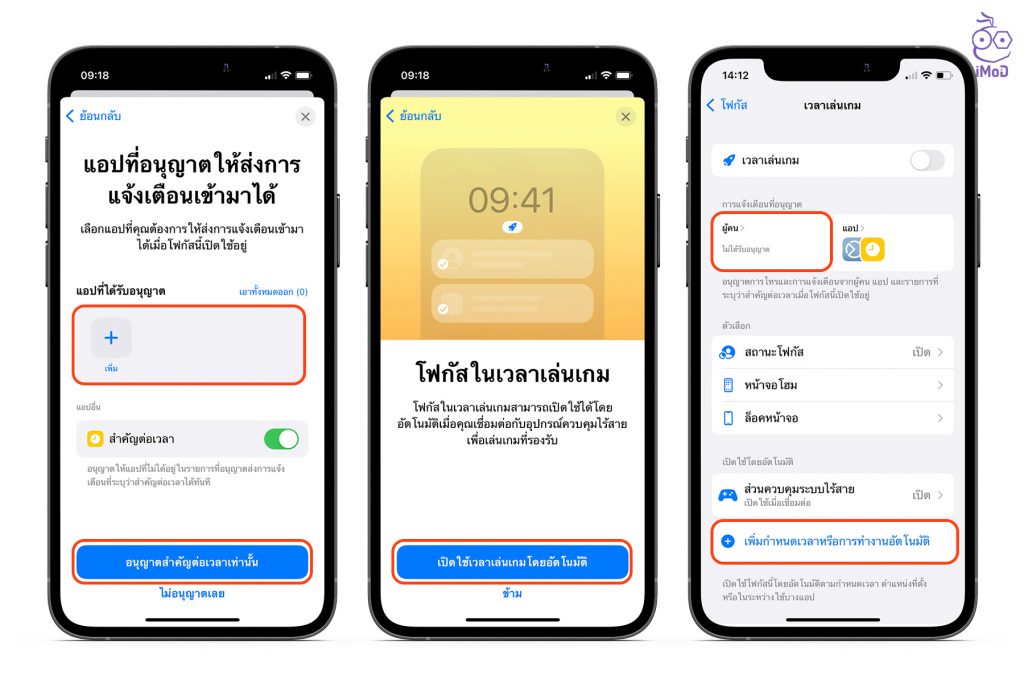 สามารถเพิ่มแอปที่อนุญาตให้ส่งการแจ้งเตือนระหว่างเปิดโหมดโฟกัสได้ จากนั้นแตะ อนุญาตสำคัญต่อเวลาเท่านั้น > เปิดใช้เวลาเล่นเกมโดยอัตโนมัติ > จากนั้นให้เราตั้งค่า ผู้คนที่สามารถโทรเข้าระหว่างอยู่ในโหมดนี้ได้ และด้านล่าง ให้แตะ เพิ่มกำหนดเวลาหรือการทำงานอัตโนมัติ
