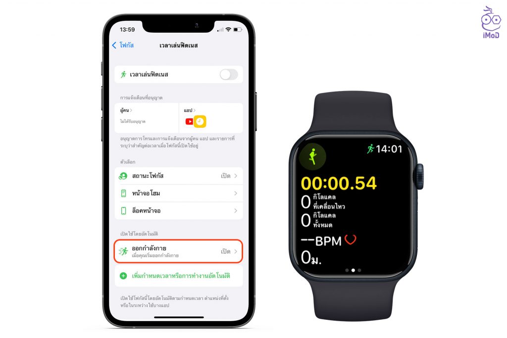 ถ้าหากเราแบ่งเวลาไว้ออกกำลังกายและไม่อยากจะให้มีการรบกวนจากการแจ้งเตือนต่าง ๆ ก็สามารถตั้งค่าให้เปิดโหมดโฟกัสเวลาเล่นฟิตเนสอัตโนมัติได้ โดยเมื่อเราเริ่มออกกำลังกายด้วยแอป Workout หรือแอปออกกำลังกายอื่น ๆ โหมดนี้ก็จะเปิดทันที ช่วยโฟกัสในการออกกำลังกายมากขึ้น