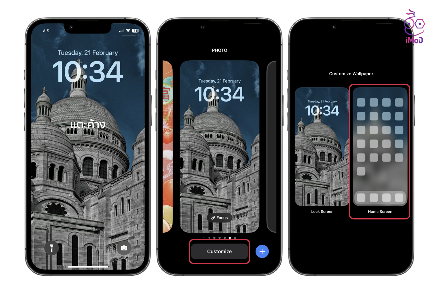 แตะค้างที่หน้าจอล็อค > เลือก ปรับแต่ง (Customize) > แตะเลือกหน้าจอโฮม (Home Screen)