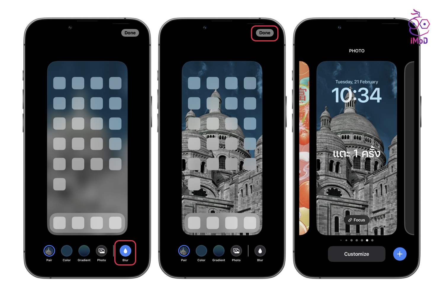 แตะไอคอนเบลอสีฟ้าด้านล่าง ให้เปลี่ยนเป็นสีเทา ภาพพื้นหลังหน้าจอโฮมก็จะชัดขึ้นมาทันที > แตะ เสร็จสิ้น (Done) > แตะที่รูปภาพหน้าจอ 1 ครั้ง เพื่อออกไปยังหน้าโฮม