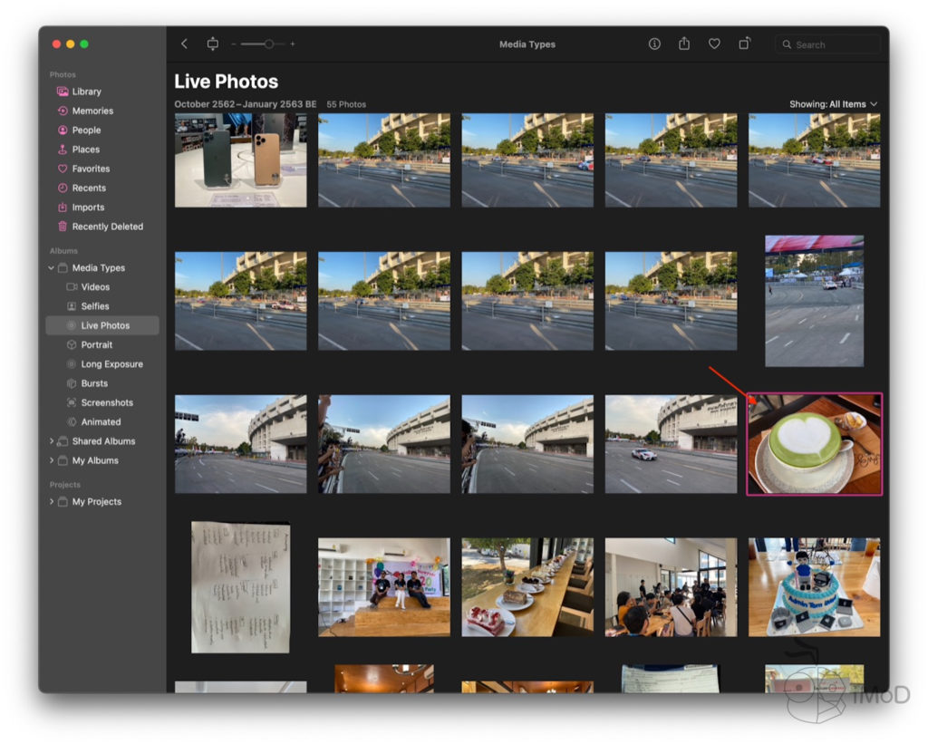 สำหรับบน Mac เราก็สามารถเปลี่ยนรูปภาพหลักของ Live Photos ได้เช่นกัน โดยไปที่แอป Photos > ส่วนอัลบั้มให้เลือก Live Photos จากนั้นก็เลือกรูปภาพที่ต้องการ